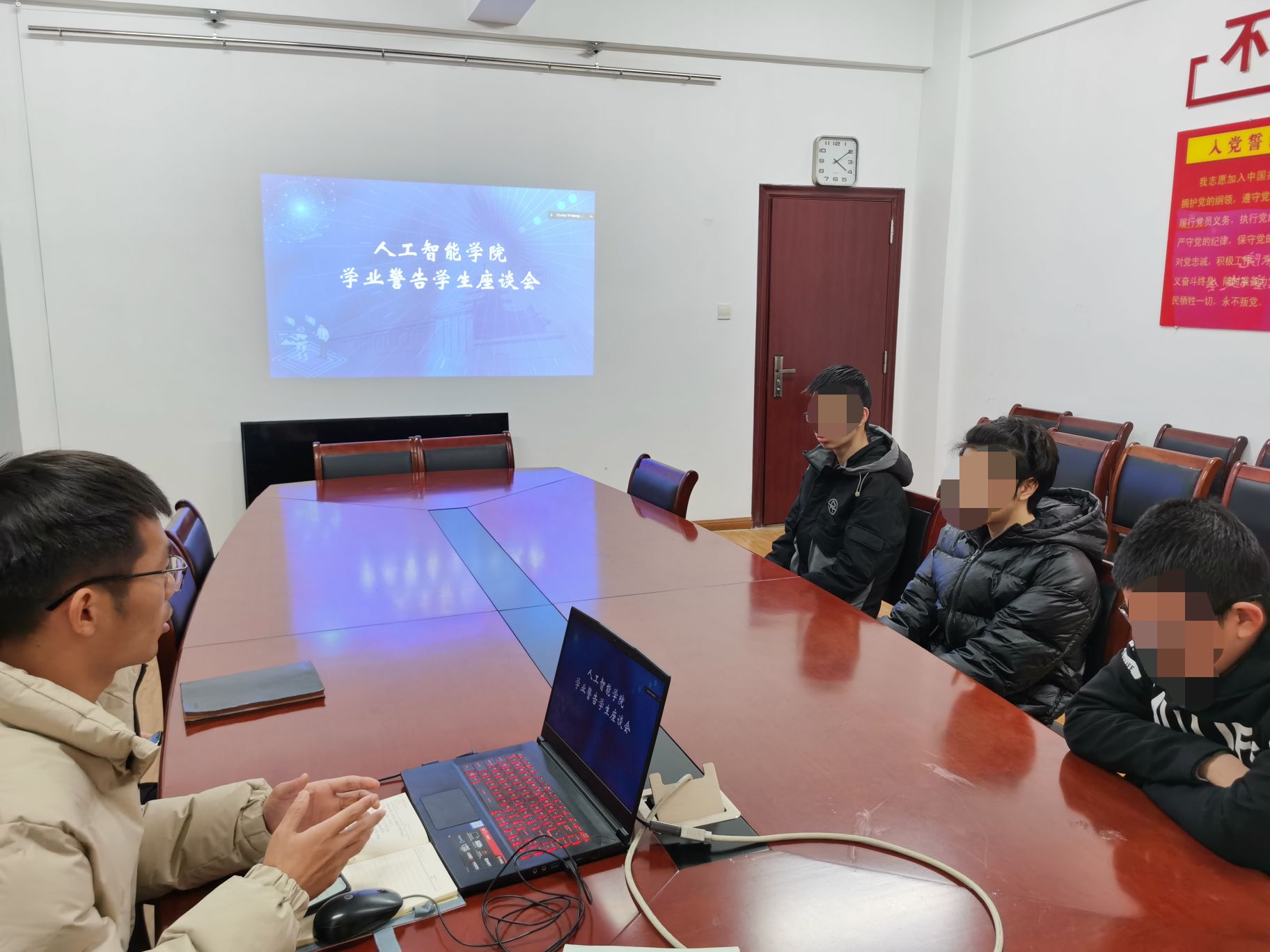教学秘书韦伟、兼职辅导员赵立敢,以及本学期受到学业警告的五名学生参加本次会议,卫岗校区学生通过腾讯会议线上参会。
