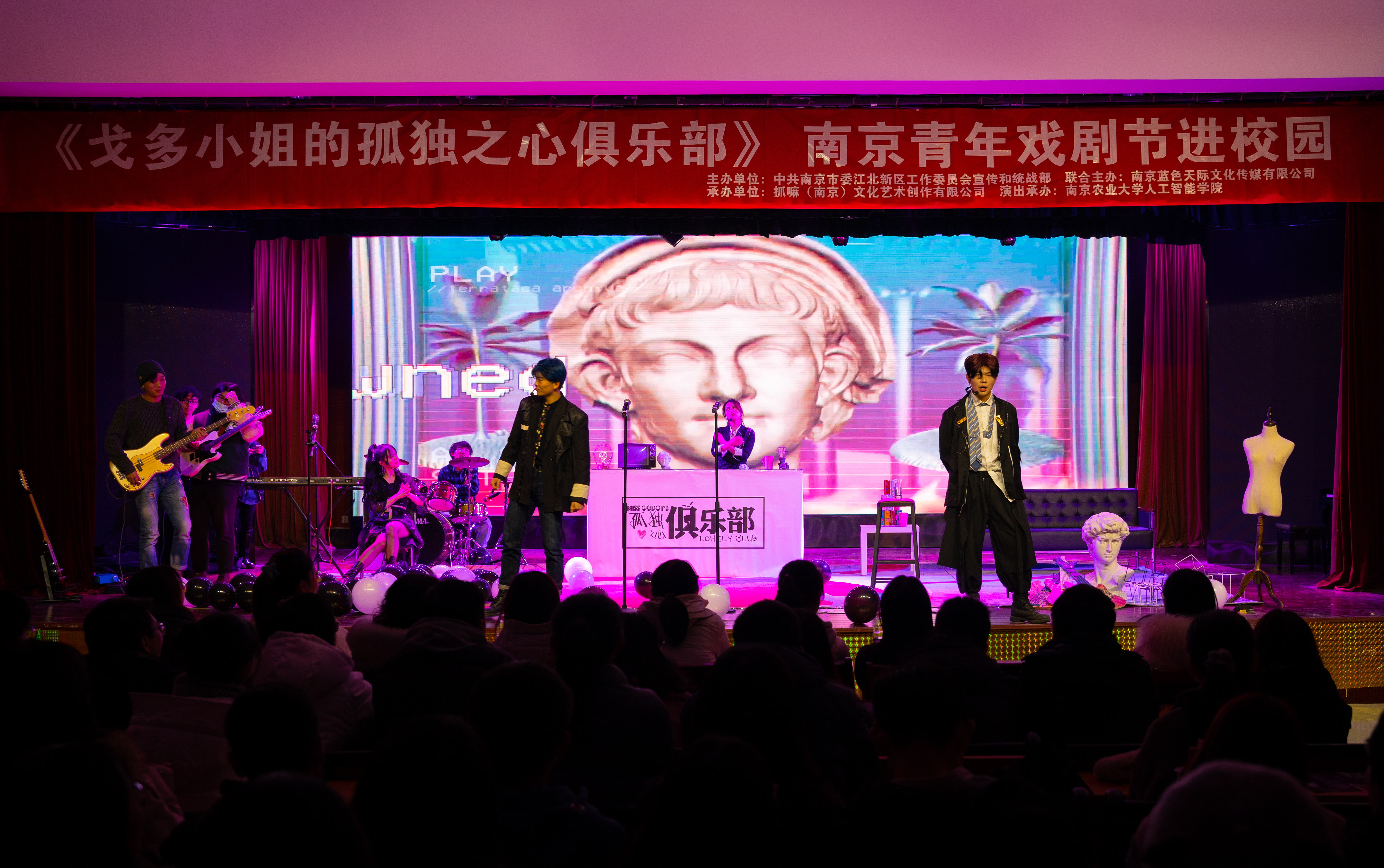 晚上19:30,《戈多小姐的孤独之心俱乐部》话剧演出正式开始,浦口区管委会、工学院、信息管理学院、经济管理学院、奈飞工厂