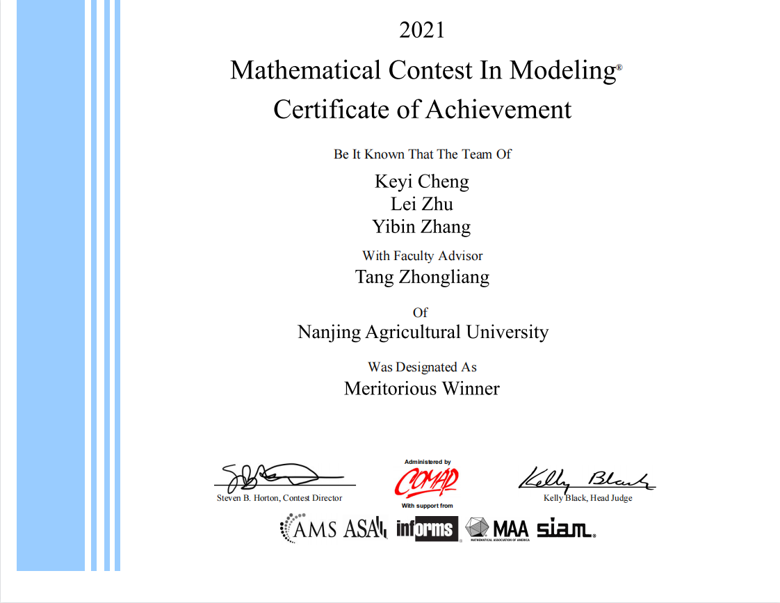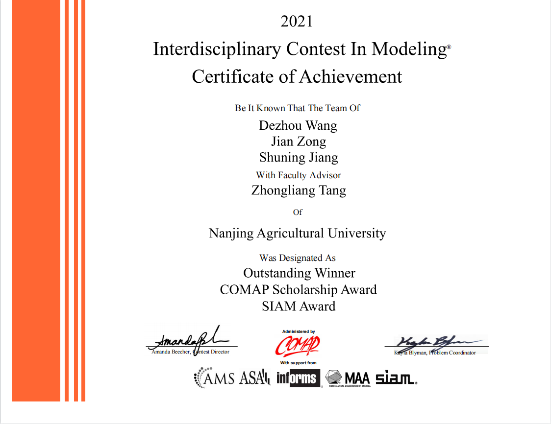 18级自动化专业王德州为队长、经济管理学院农林经济管理专业宗健、工学院交通运输专业蒋舒宁为队员组成的队伍(指导教师唐中良)喜获O奖(国际特等奖),额外获得了两项冠名奖(COMAP Scholarship Award & SIAM Award,COMAP Scholarship Award 仅奖励全球成绩最佳的四支参赛队伍,奖金为一万美元,SIAM Award 仅奖励全球成绩最佳的六支参赛队伍)。这是奈飞工厂