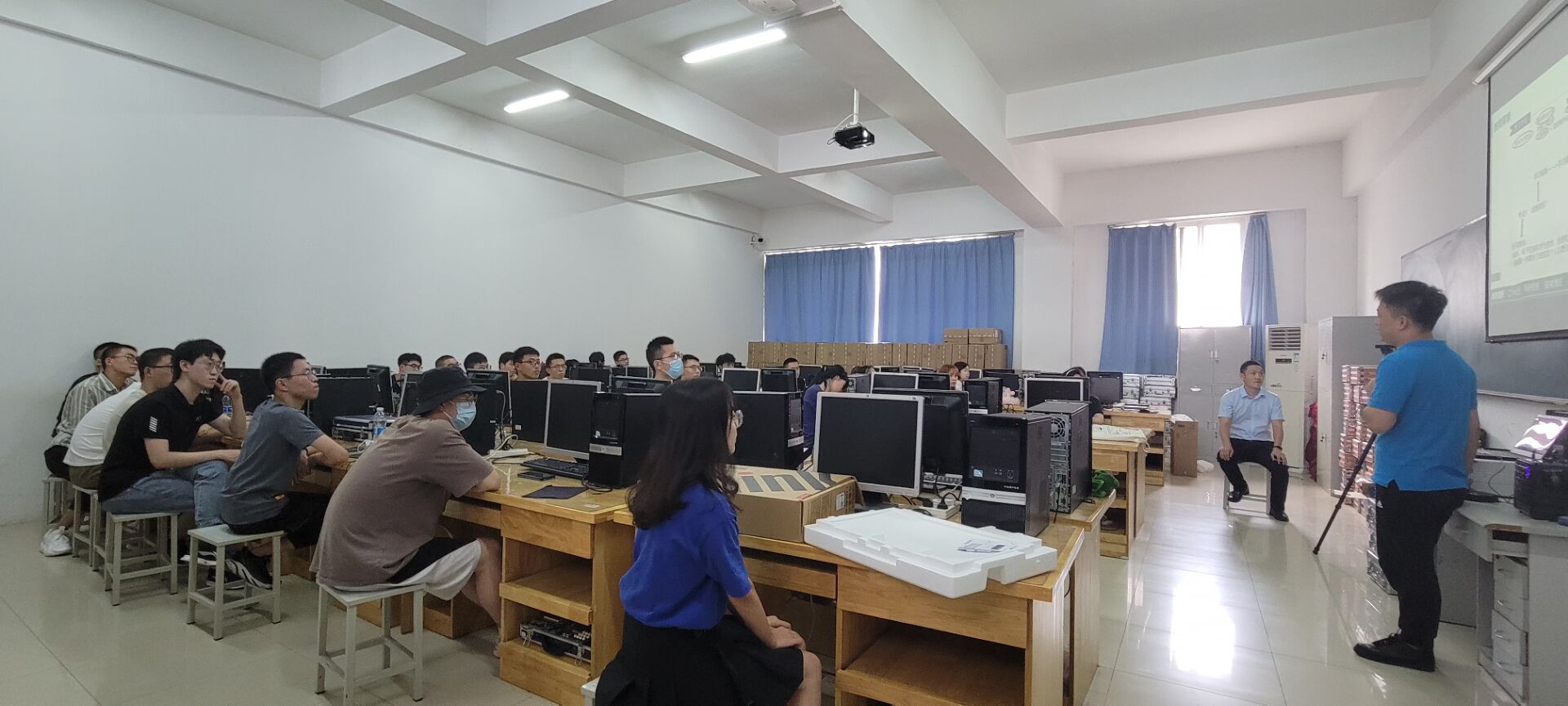 “实验室科研初探”模块,防疫条件许可下,有序组织部分学生走进实验室。现场邀请了张博学长,同时视频连线了张政学长。两位优秀学长向大家分享了本科生涯中实验室中的成长经历,传授科研经验,解答疑惑,同学们虽为实验室初探,但纷纷表示获益匪浅。