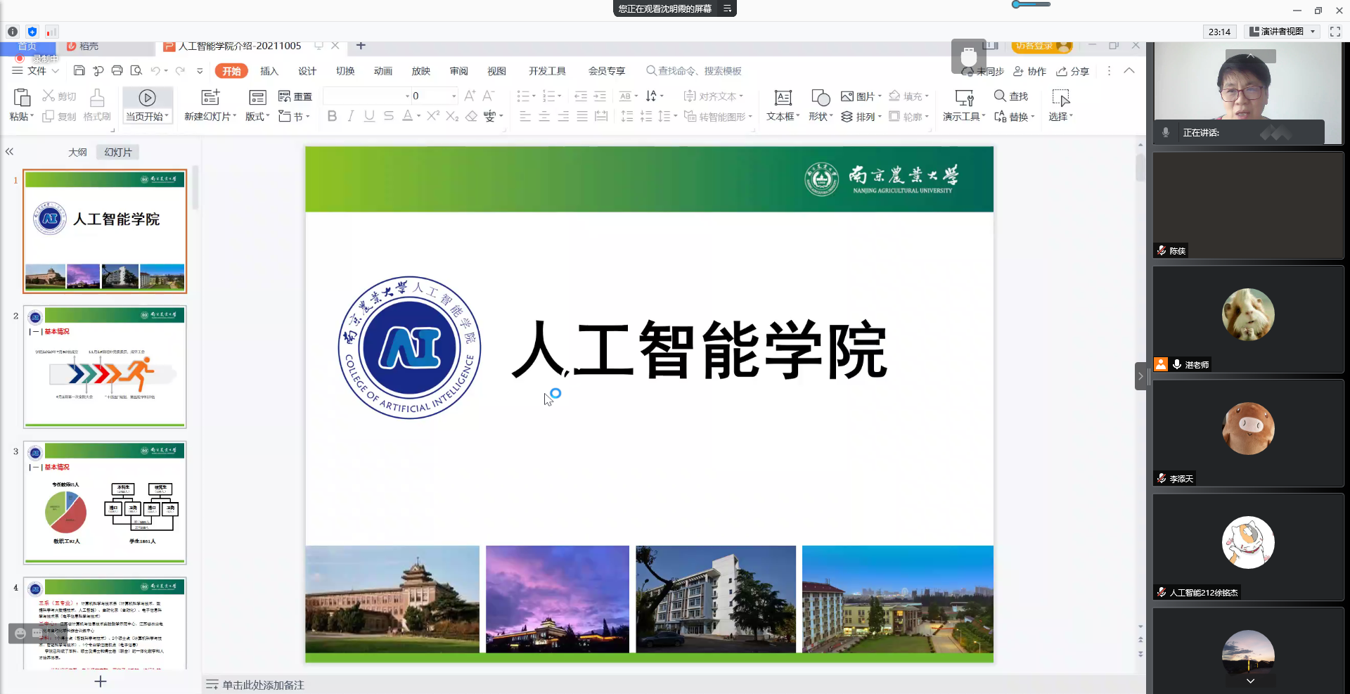 “院史院情介绍”板块,特邀学院党委副书记(主持工作)沈明霞教授担任主讲。沈教授从学院基本情况、学科分布、教学与人才培养、科研方向、平台建设等诸多方面进行了详细介绍。此外,结合案例生动阐述了人工智能产业链的现状与前景,极大地开拓了学生们的视野。