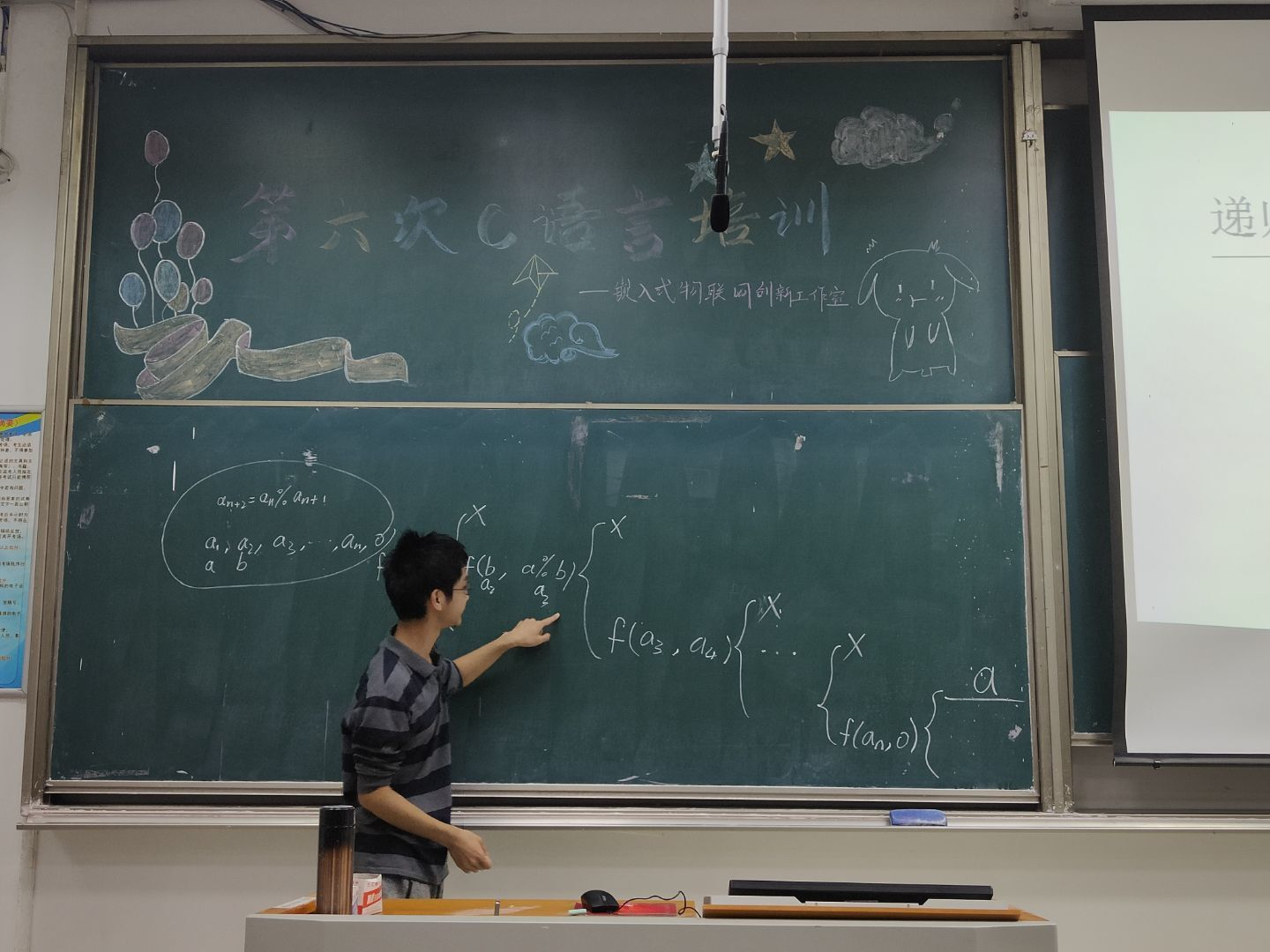 七次培训分别由AI工坊工坊研发处的陈雨昕、王浩鹏、蔡圣意、邵海涛同学,与嵌入式物联网创新工作室研发部的赵捷庸、杨璐璐担任主讲人。他们将专业的C语言知识以通俗易懂的方式展现在培训中,加之自己的独到见解,便于参训人员更好的理解与感悟C语言。