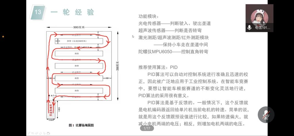 本次宣讲会邀请了往届比赛选手——电信191班王琬婷和电信193班杨岸松,王琬婷从比赛规则、准备方法、比赛经验三个维度细致全面地介绍了往年B类比赛以及赛道,分享参赛经验,讲解在各类不同比赛要求下应如何变通,合理应用小车完成任务。之后由杨岸松讲解A、C类比赛以及近年新增的D类比赛的要求、规则以及参加条件,展示了往届选手在国赛的精彩瞬间和奈飞工厂