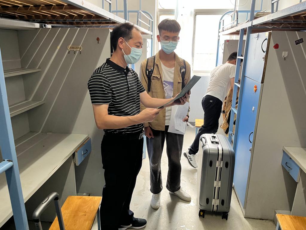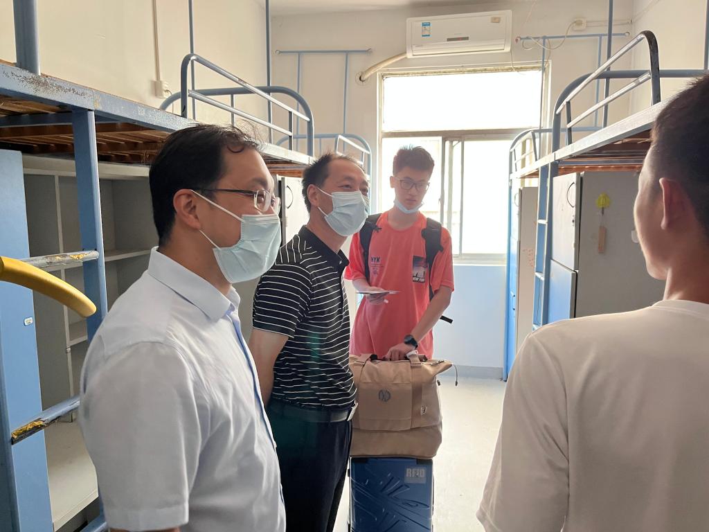 9月3日9时,院党委书记田永超,副院长刘杨来到报到现场,了解迎新工作情况,慰问工作人员和志愿者,询问迎新过程的防疫举措。他们首先对工作人员的耐心付出给予了充分肯定,同时也指出,当前疫情防控工作仍不可松懈,必须增强责任意识,要在做好疫情防控的前提下,为新生提供更加细致周到的服务。随后,田永超、刘杨又来到新生宿舍区慰问关心新生。