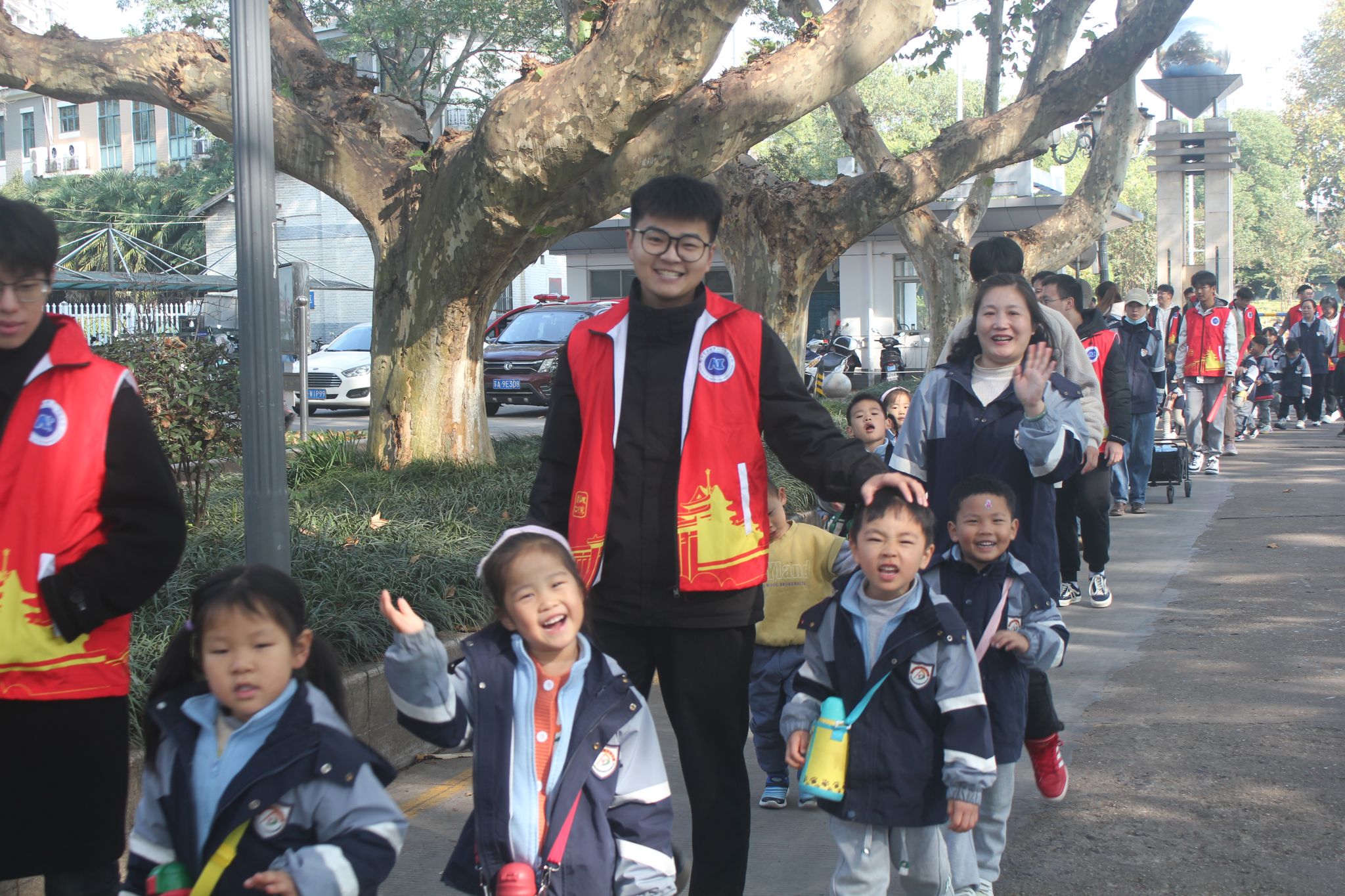 浦口校区。志愿者和孩子们“大手牵小手”踏着落叶,感受秋天的宁静与充实,体悟自然带给我们的美好风光。在游览校园的过程中,小朋友们和哥哥姐姐一起捡落叶,将树叶拼凑成一幅幅画卷,留住秋天的回忆。