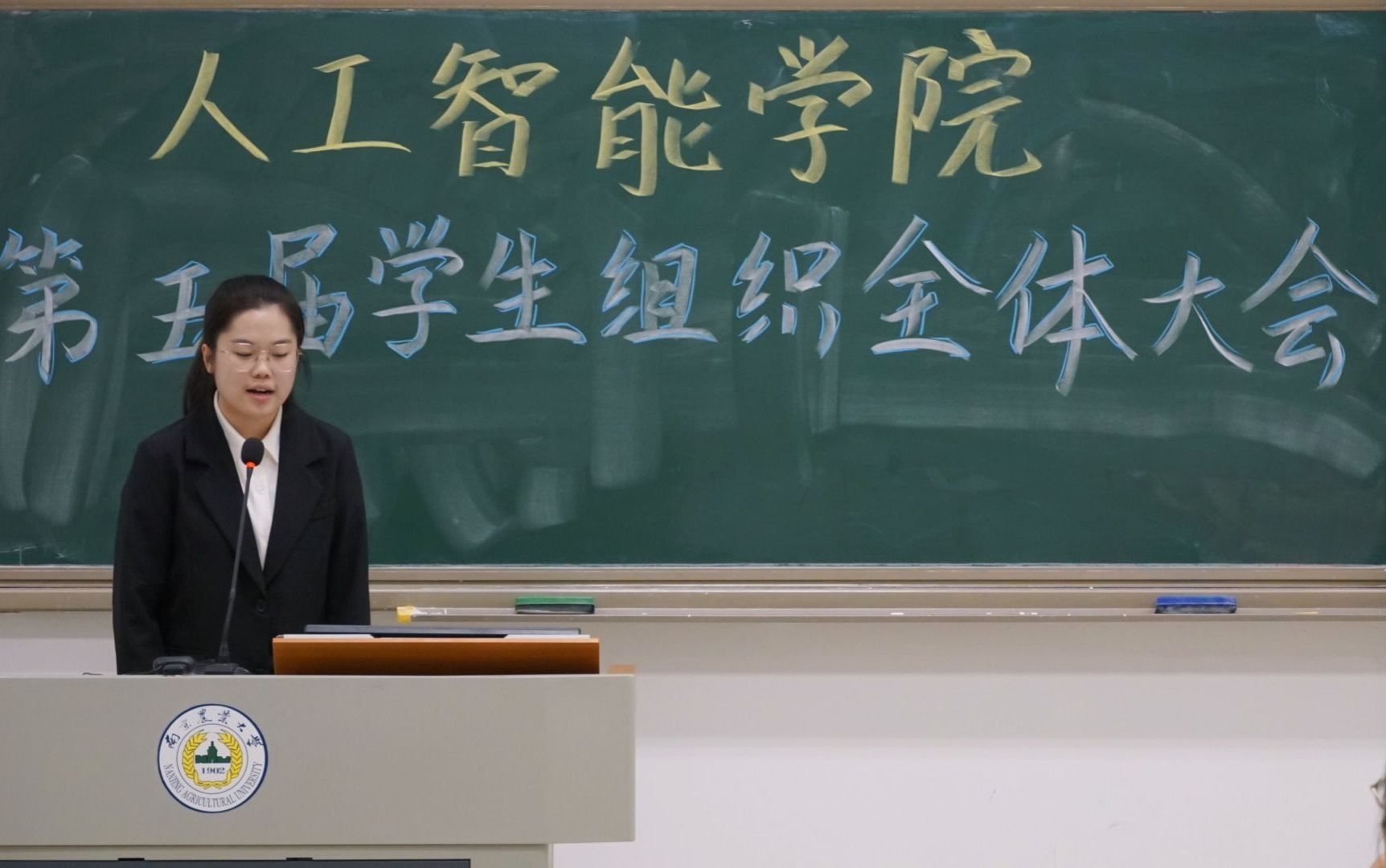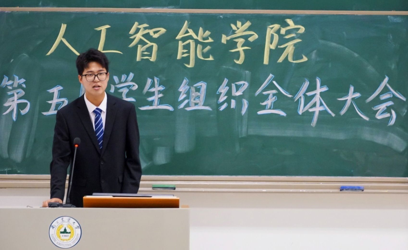 第五届学生组织主席团成员开始工作汇报。分党校副秘书长张耀波、学生团委副书记刘志亮、学生会执行主席冯小航、全媒体中心主任赵子函以及AI工坊主席徐浩然分别代表各自部门进行工作汇报,介绍各自部门的主要职能、特色活动以及2023-2024学年度举办的各类活动和获奖情况,充分展示各部门的辛勤付出和取得的显著成果。