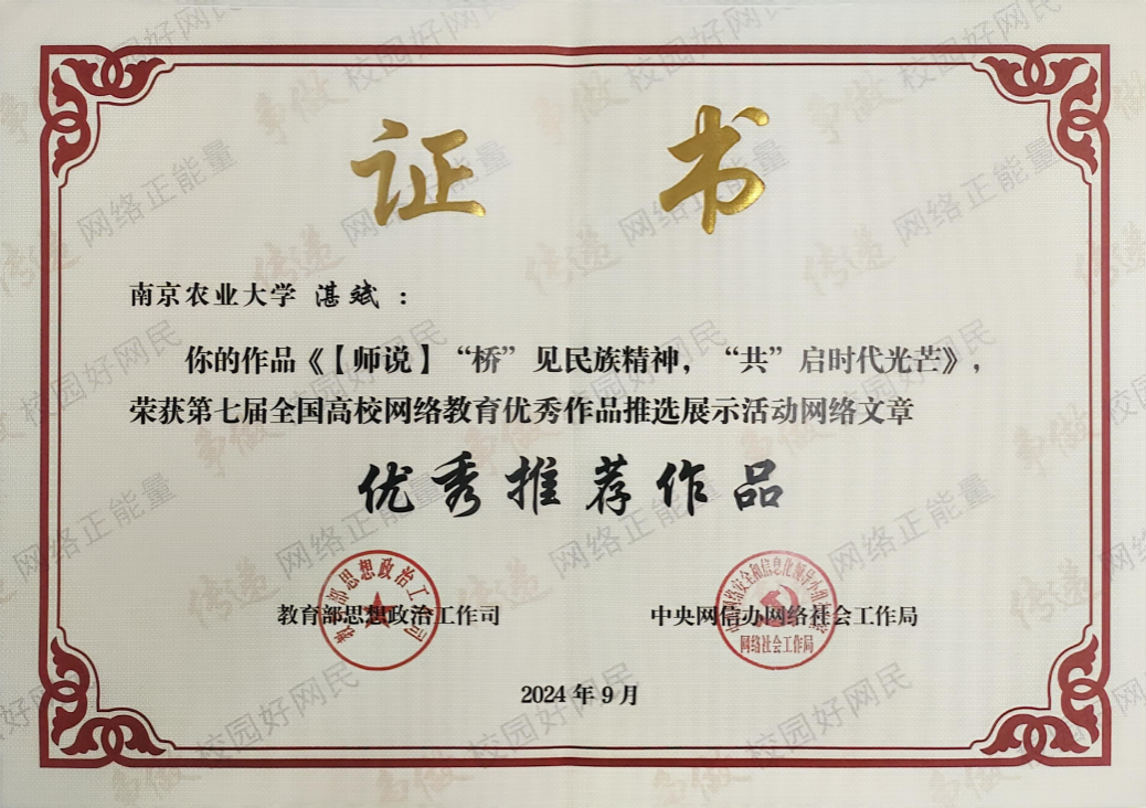 辅导员湛斌老师撰写的作品《“桥”见民族精神,“共”启时代光芒》获得第七届全国高校网络教育优秀作品推选展示活动网络文章类“优秀推荐作品”奖。