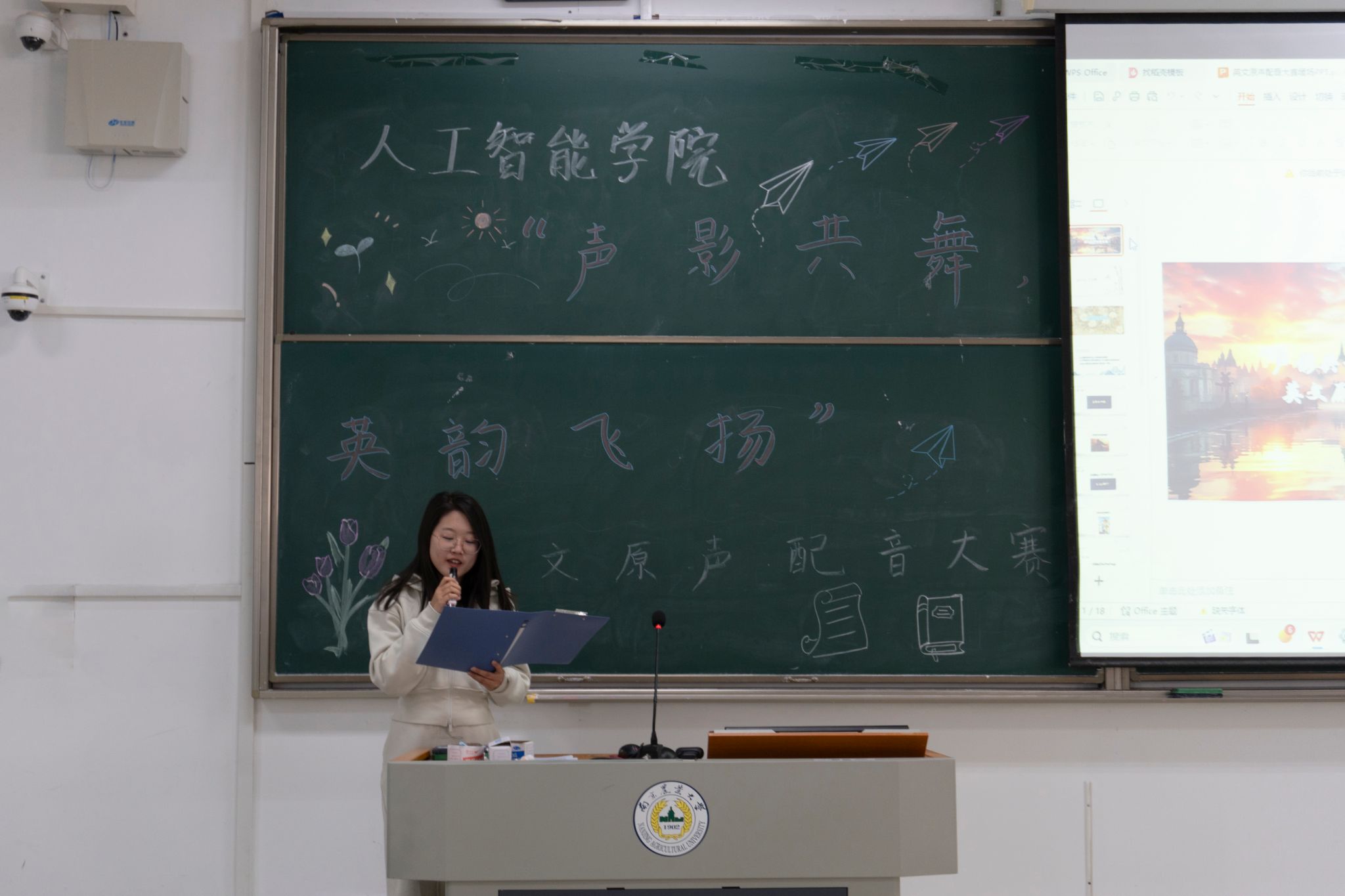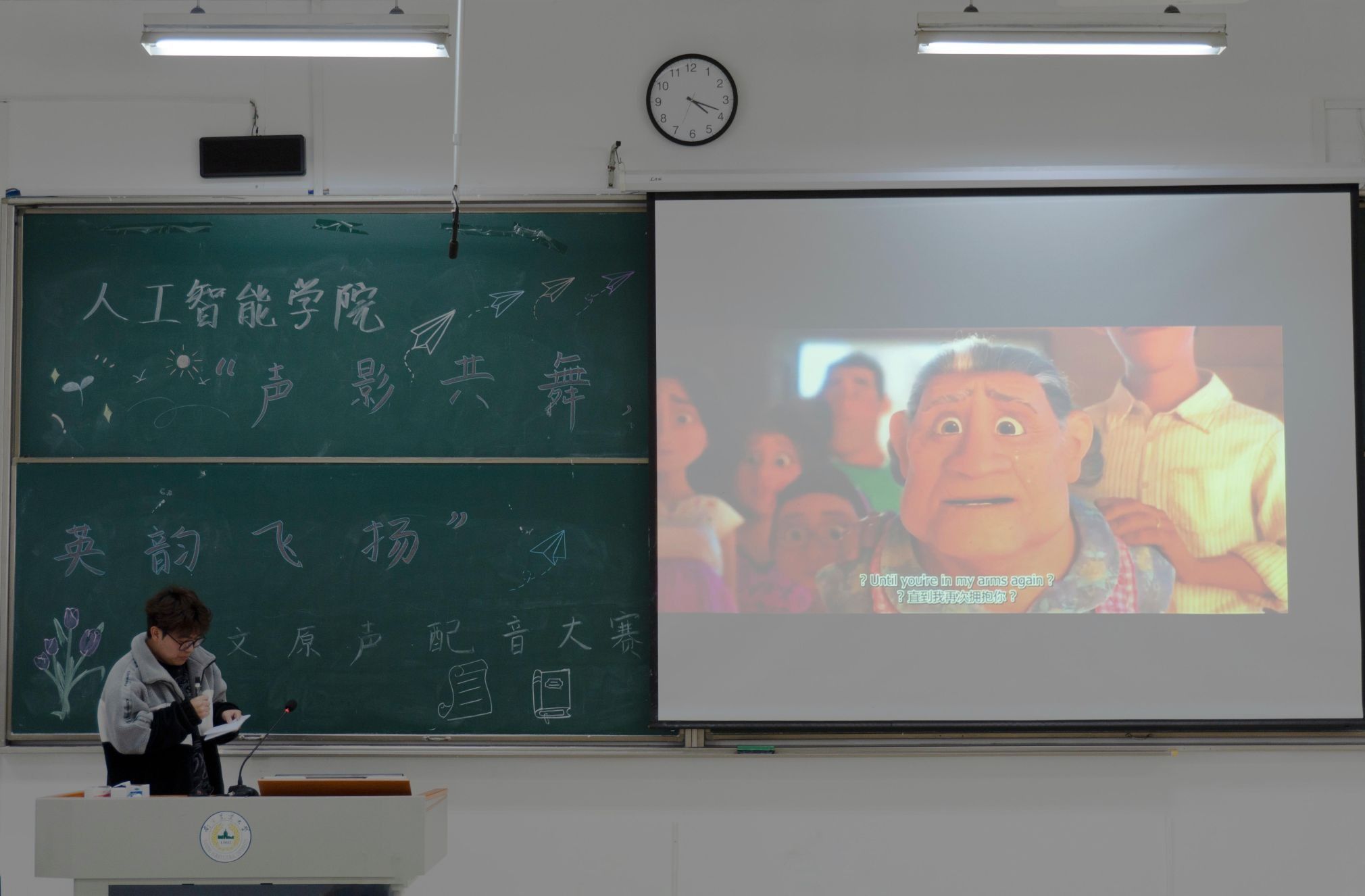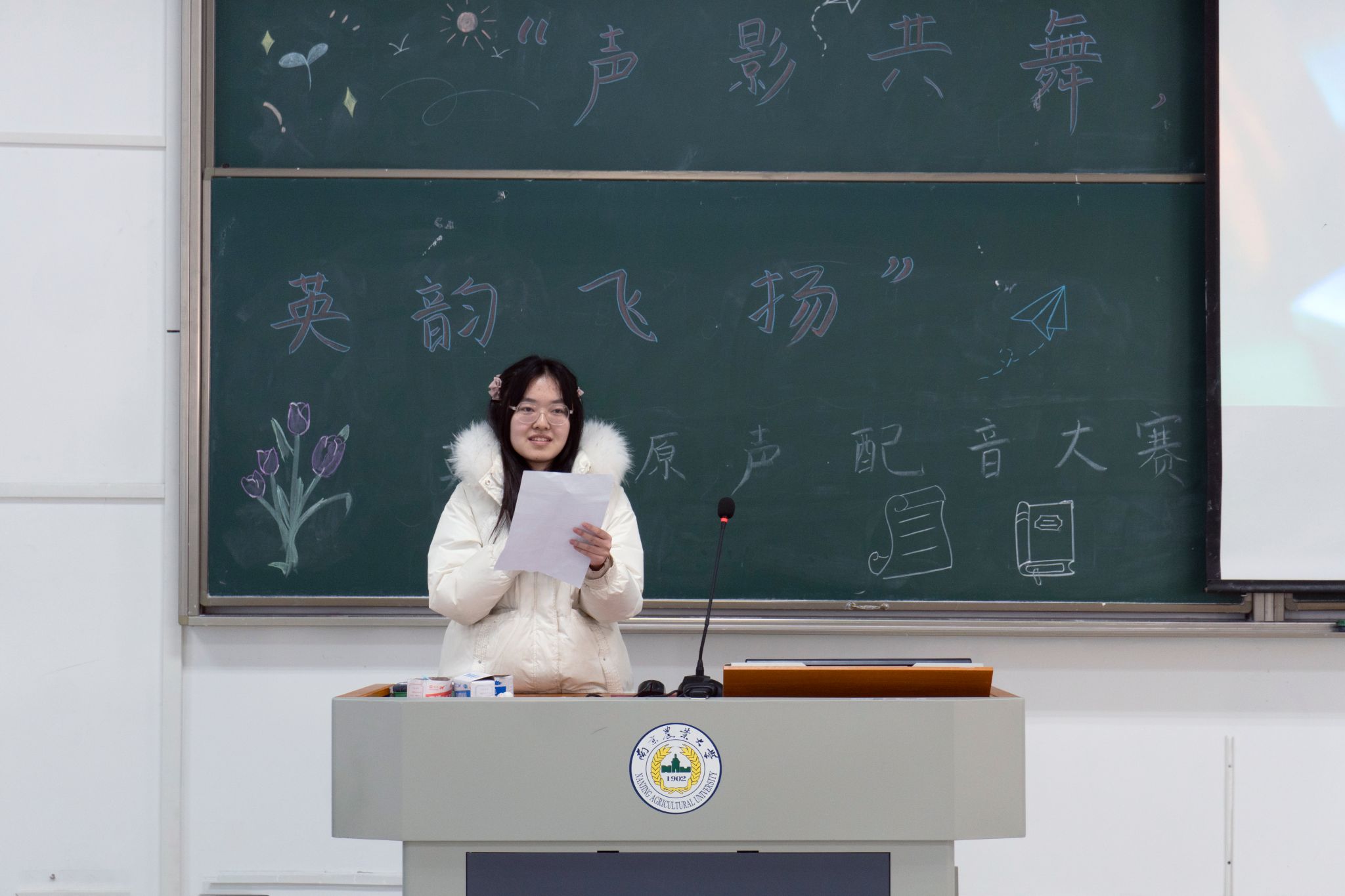 于博远楼C501教室举办“声影共舞,英韵飞扬”英文原声配音大赛,特邀张丽老师和两名英语协会人员张翡宸、顾亦旸担任评委,通过趣味性与专业性兼具的赛事,助力学生提升语言实践能力。
