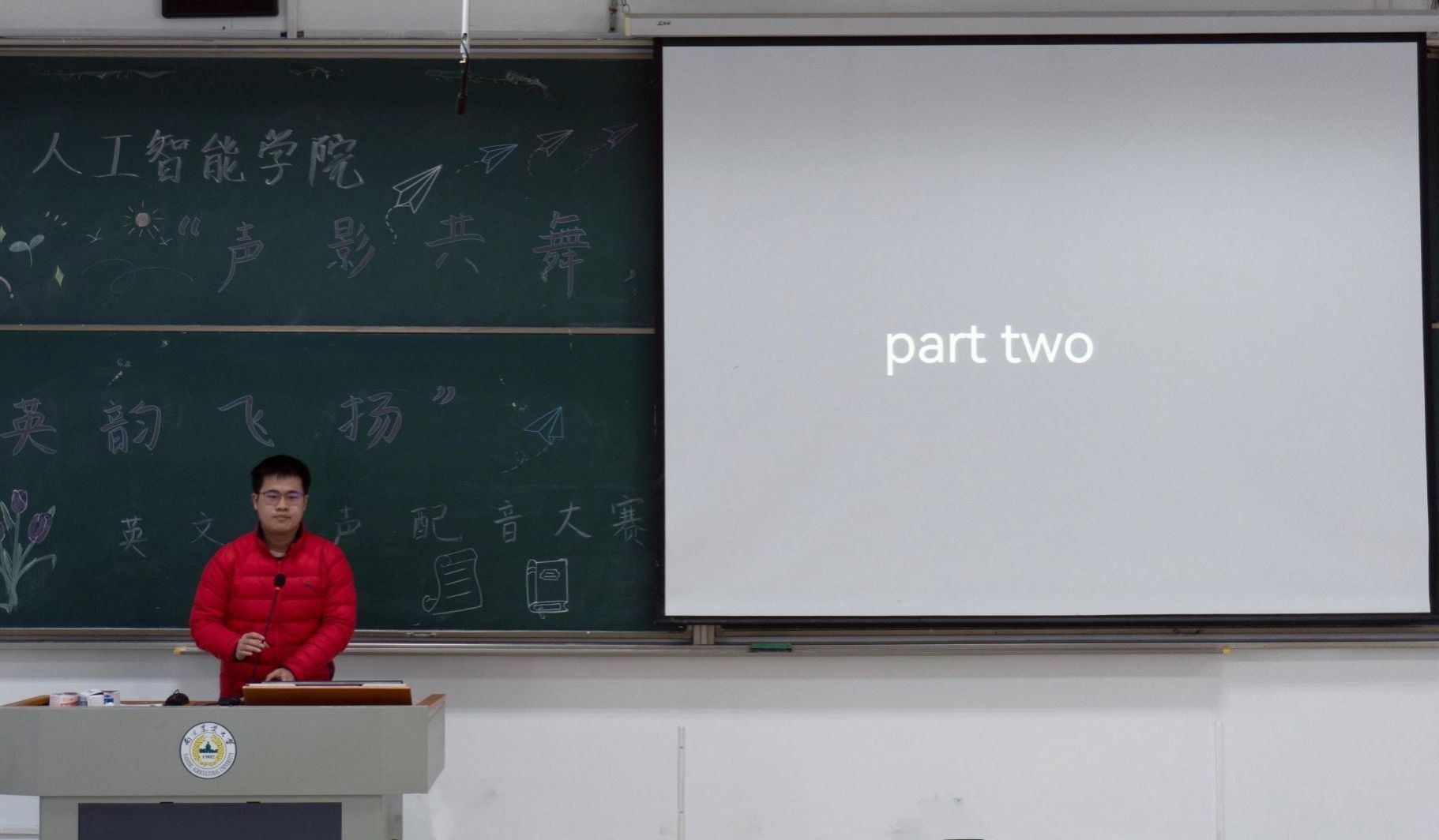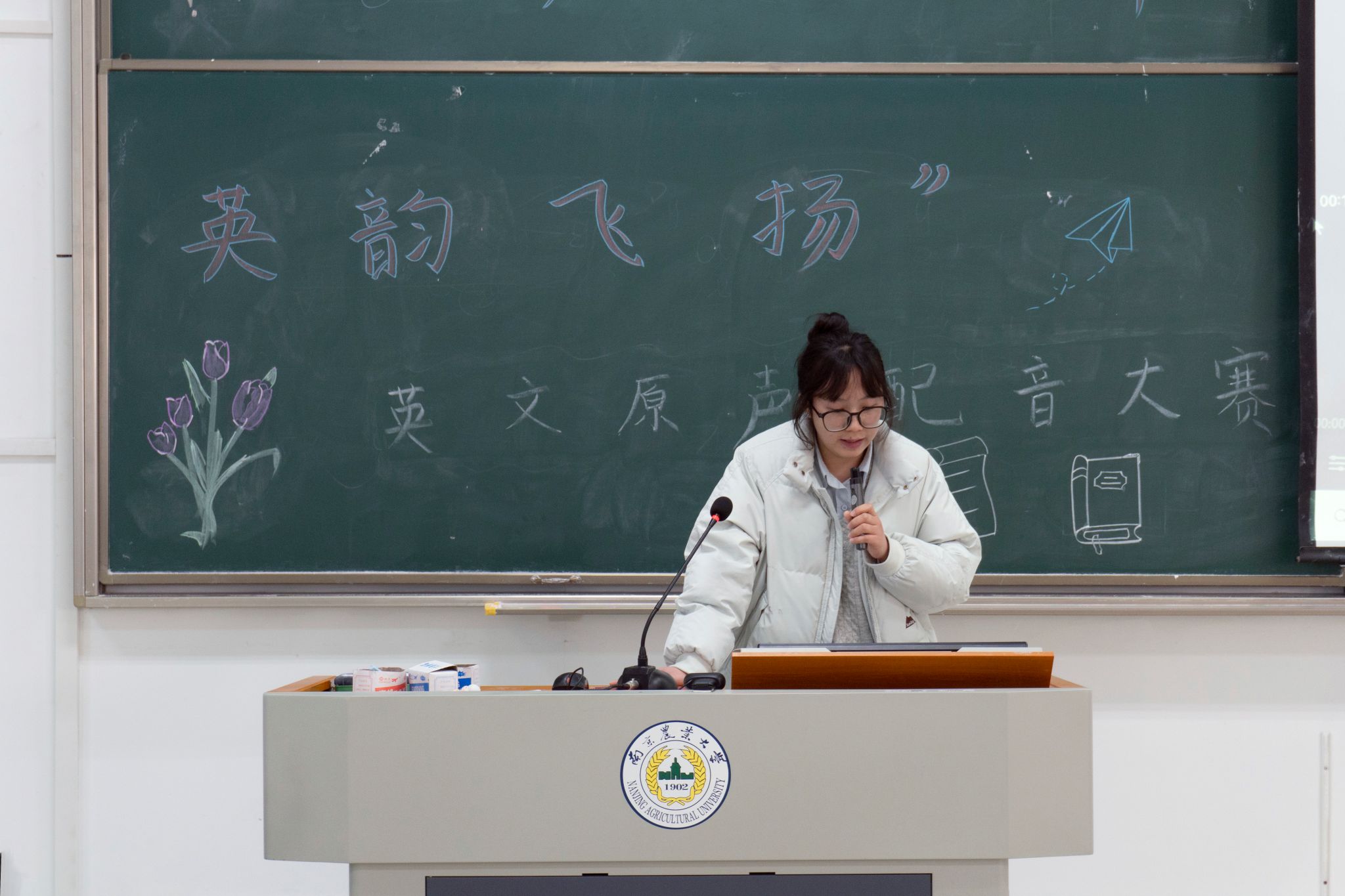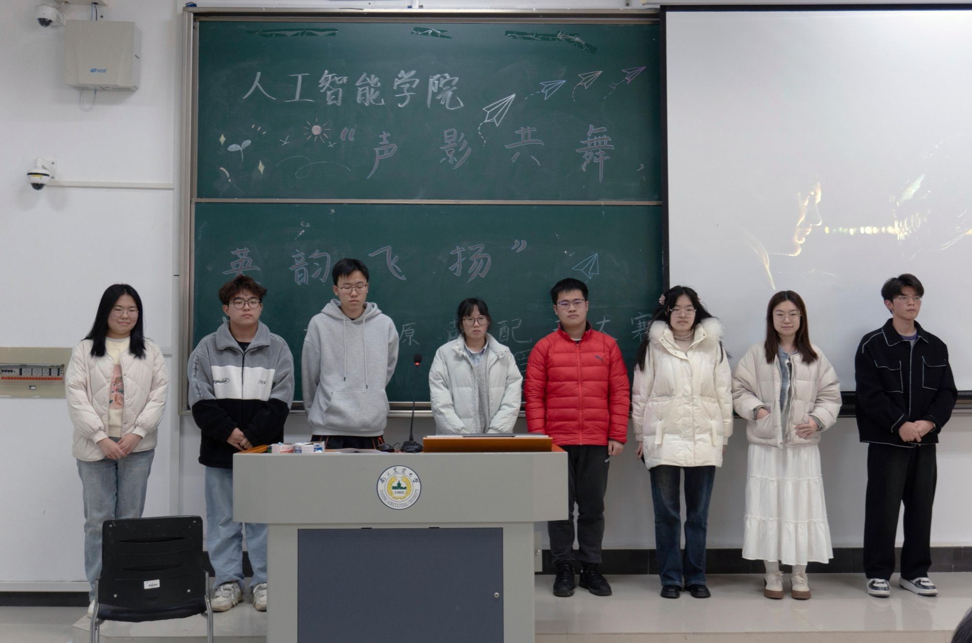 于博远楼C501教室举办“声影共舞,英韵飞扬”英文原声配音大赛,特邀张丽老师和两名英语协会人员张翡宸、顾亦旸担任评委,通过趣味性与专业性兼具的赛事,助力学生提升语言实践能力。