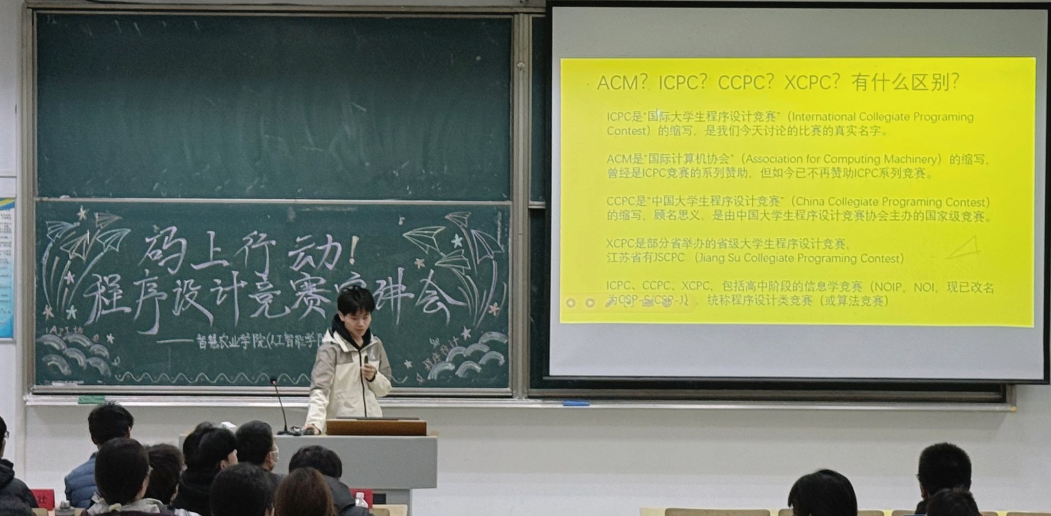 AI工坊在汇贤楼C102教室成功举办了程序设计竞赛宣讲会。本次宣讲会聚焦ICPC、CCPC、JSCPC及中国高校计算机系列赛之团体程序设计天梯赛(以下简称团体程序设计天梯赛)四类赛事,为编程爱好者搭建了精准的赛事认知与备赛指导平台。