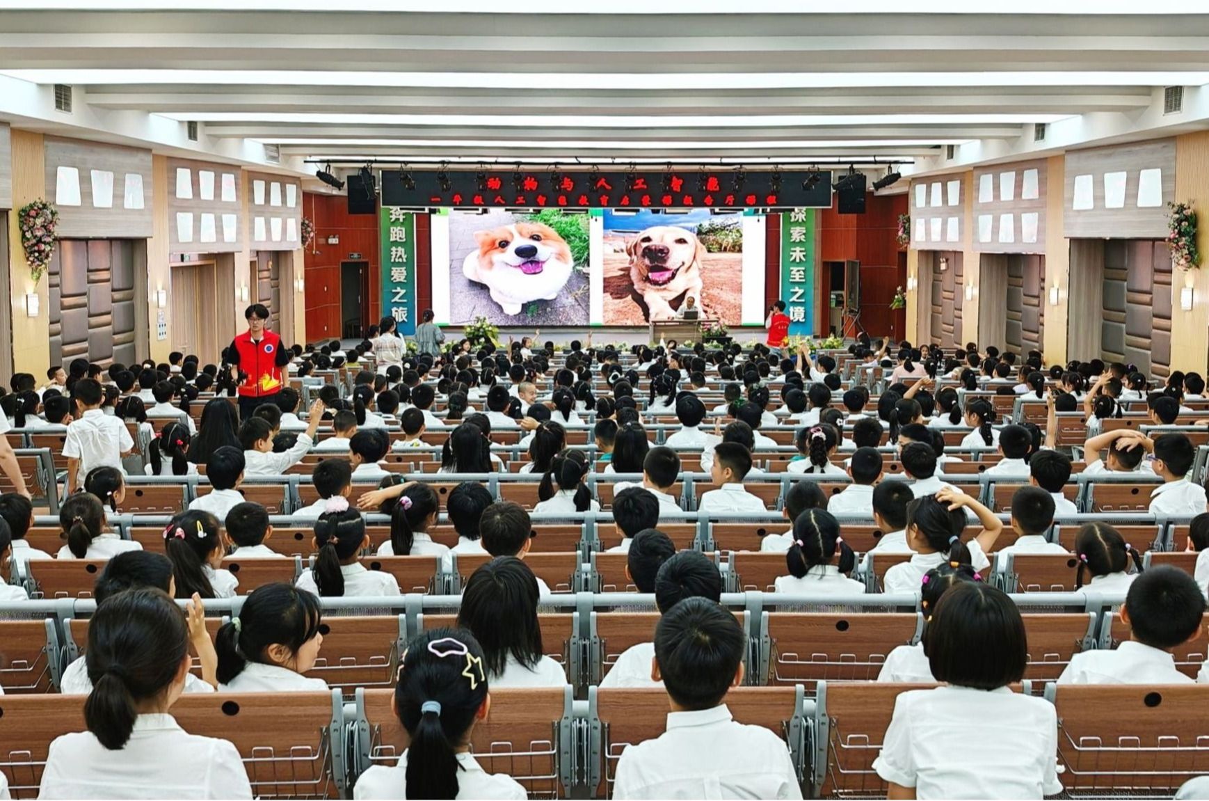 互动环节气氛热烈,小学生们踊跃提问。“人工智能为何功能强大?”、“机器人为何有的需遥控有的不需?”、“是否有猫形机器人?”等充满童趣和好奇心的问题层出不穷。刘杨耐心解答,并鼓励大家积极思考,现场互动积极活跃。