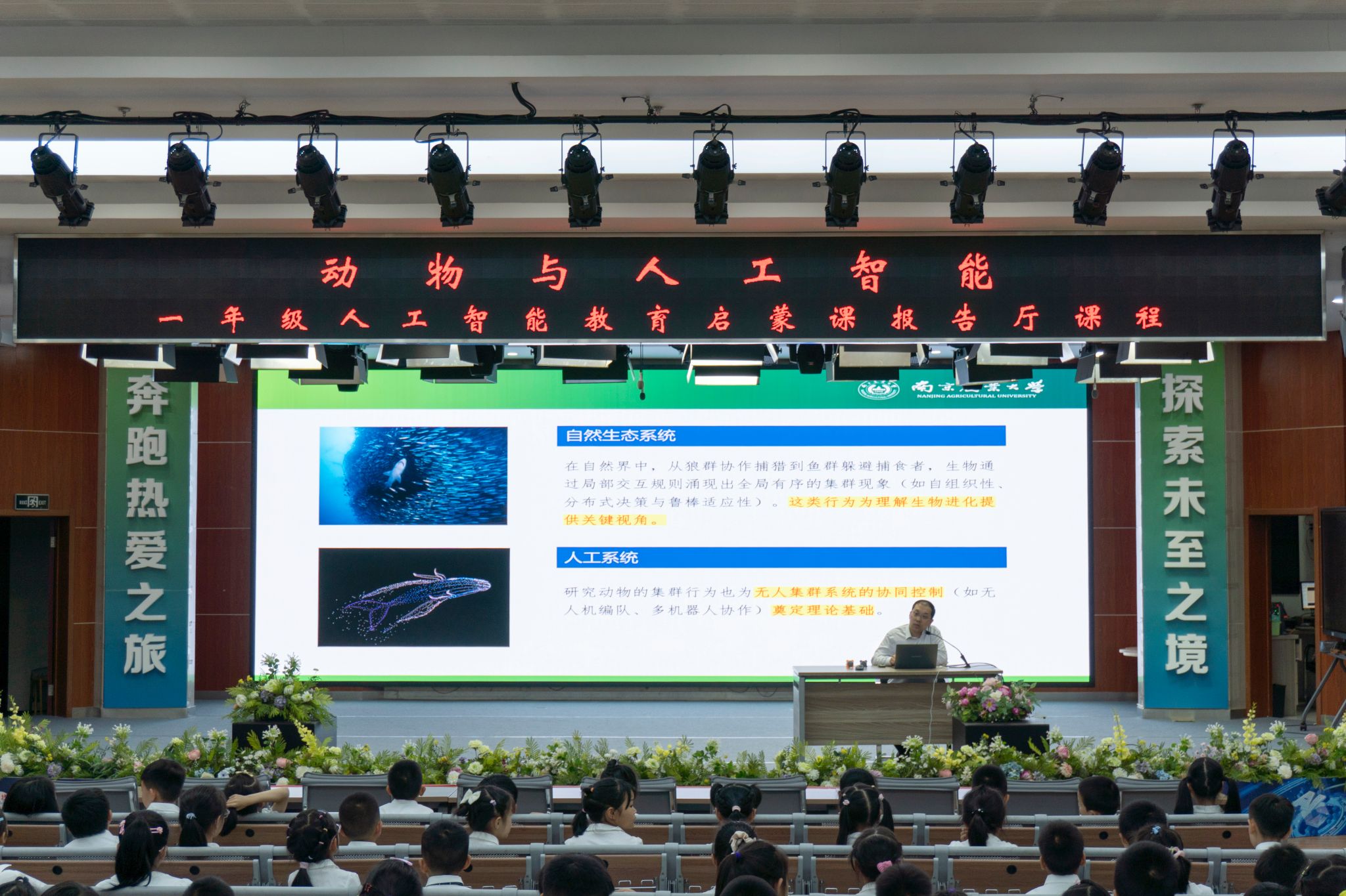 随后,刘杨副院长带来题为“人工智能与动物之间的故事”的专题分享。他从仿生智能切入,阐释了动物研究对人工智能发展的启发,丰富的仿生动物应用令现场惊叹不已;他解读了具身智能中大脑与行为关系的研究,指出这是“从生命智能迈向智能生命的关键一步”;并通过蚂蚁协作搬运的实例,生动说明了集群智能中团结合作的核心价值。刘杨寄语同学们:“多亲近自然、观察自然、向自然学习,从中汲取智慧。”
