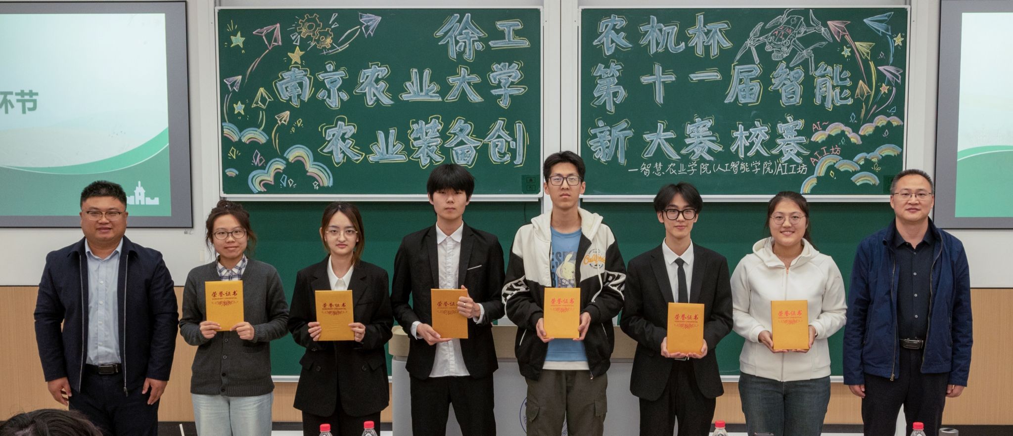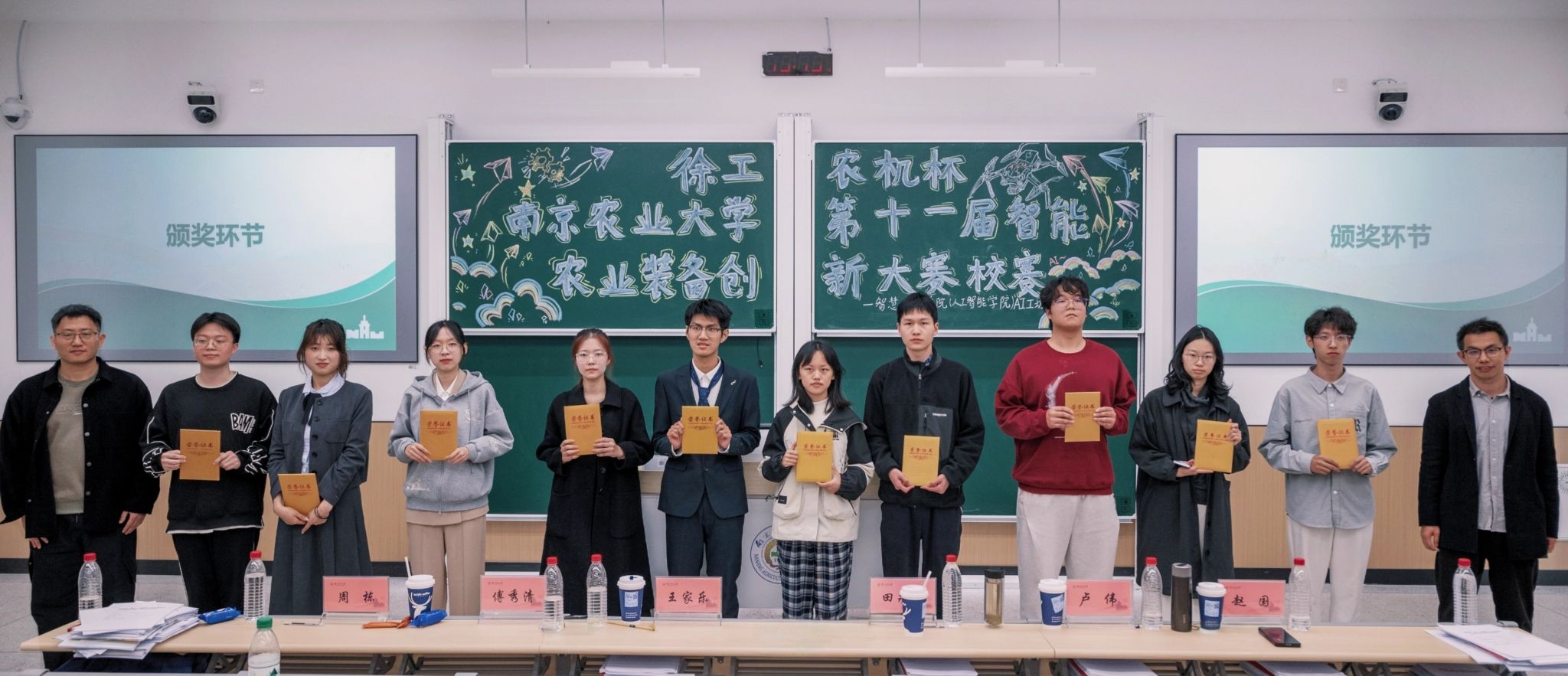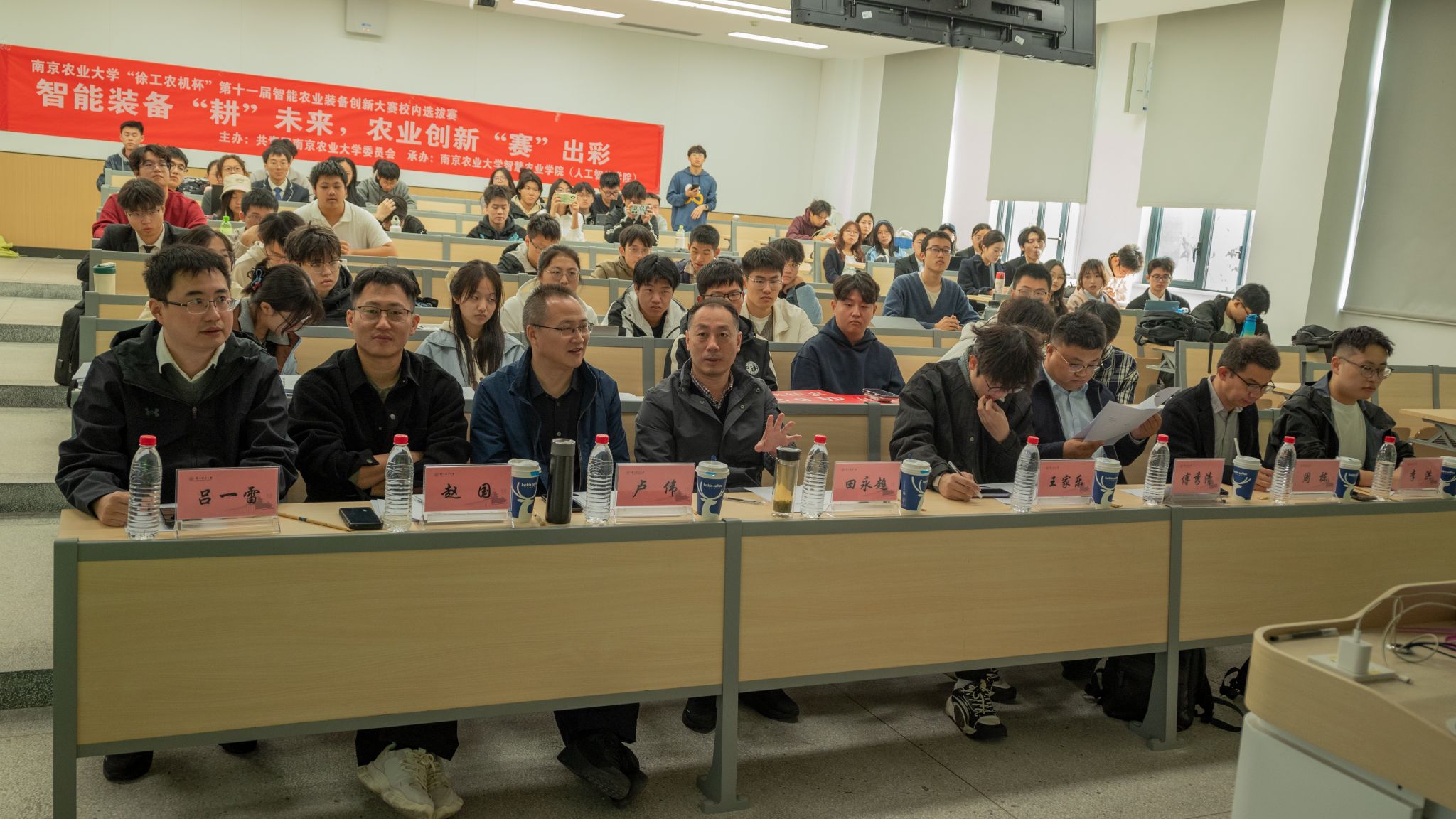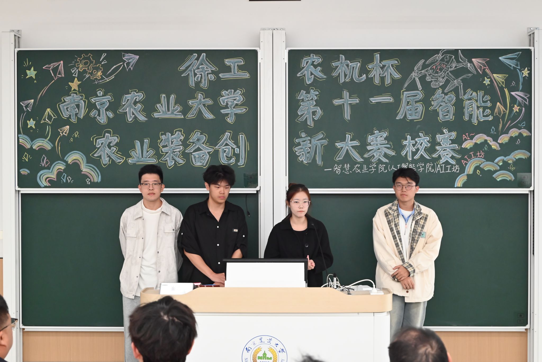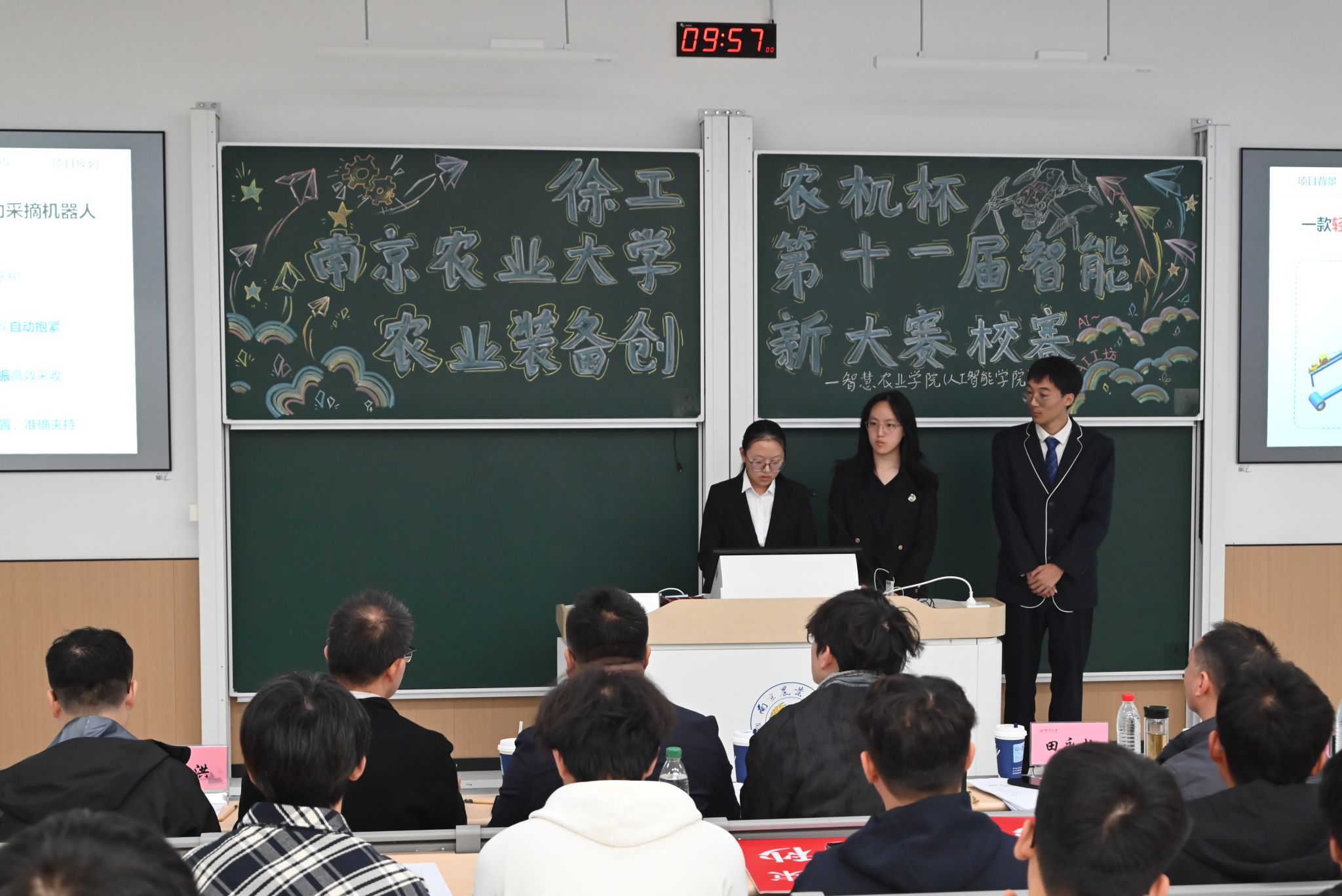 A/D类赛事在公共教学楼E103教室举办,共有31个团队入围决赛现场答辩环节。比赛采用抽签定序机制,各参赛团队按照抽签结果依次登台,汇报创新型智能农业装备的设计理念、技术原理与应用场景,并针对评委提问展开答辩。评审环节中,评委老师围绕作品创新性、实用性、可行性等方面进行评分,并针对各项目的不足提出具体改进建议,为团队后续优化方向提供指导,现场学术交流氛围浓厚。