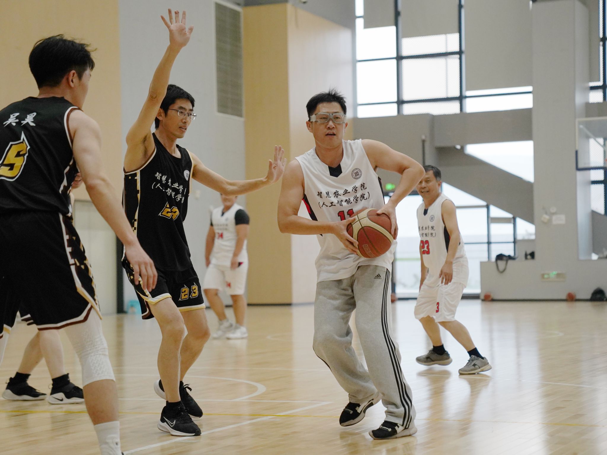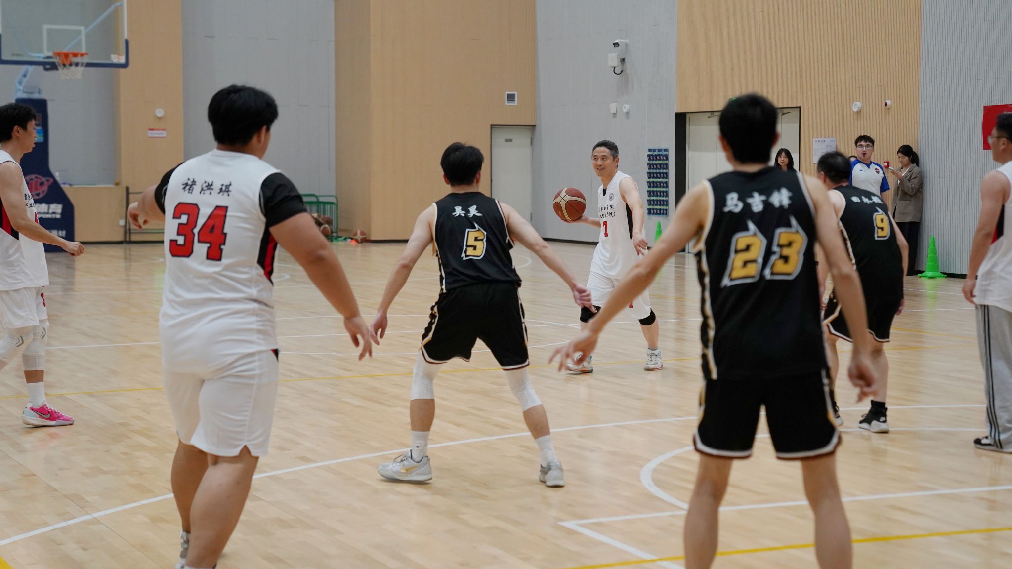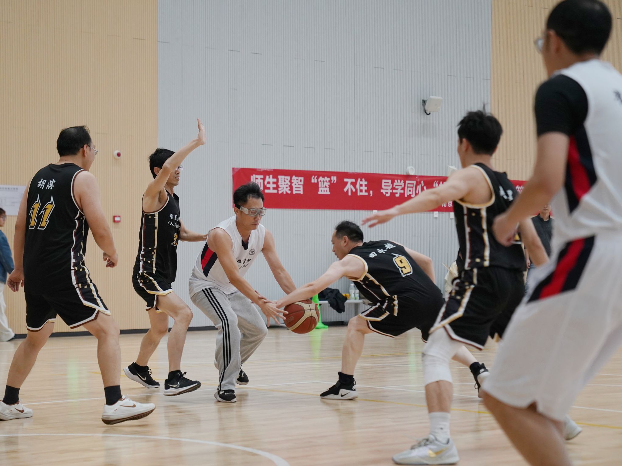 随着林江辉副部长开球,比赛正式点燃!平日里在实验室深耕、讲台授业的老师,与课堂求知、项目创新的学子换上球衣,化身默契队友。A队(李骅书记率领)与B队(田永超院长领衔)四节交锋,每一秒都精彩拉满:A队首节上篮拿下首分,瞬间引爆全场;研究生球员灵活突破、利落得分,尽显青春锐气;B队一记精准中投空心入网,引得观众欢呼雷动,将气氛推向高潮。