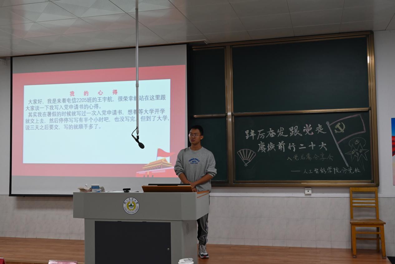 为强化榜样示范,优秀学生党员代表杨凯云同学结合自己入党的心路历程,从夯实专业知识、服务班级同学、全面提升自我等方面作了交流分享,用守初心、践初心的经历为2022级同学申请入党指明了努力方向,引导新生自觉树立正确政治立场和思想导向。