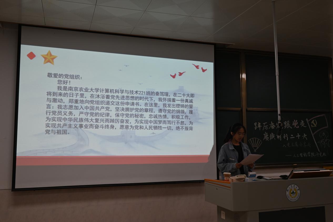 为表达强烈的入党意愿,2022级新生王宇航、秦笃瑄同学分享了自己的入党申请书。王宇航同学结合了自身实际故事,表达了自己对党深深的崇敬与坚定的跟随。秦笃瑄同学则从自己对党史的学习和自身的感想出发进行了分享,字里行间透露着对中国共产党的强烈归属感,对如何成为一名合格党员的客观认识。通过分享入党申请书,不仅加深了新生对党的认识,提升思想觉悟,更激励了新生坚定理想信念,矢志拼搏奋斗!