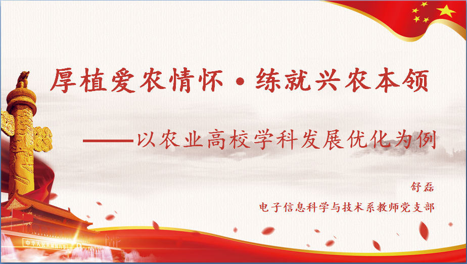 为深入学习贯彻落实习近平新时代中国特色社会主义思想和党的二十大精神,7月1日,电子信息科学与技术系教师党支部书记舒磊为支部党员讲授了《厚植爱农情怀·练就兴农本领——以农业高校学科发展优化为例》专题党课。