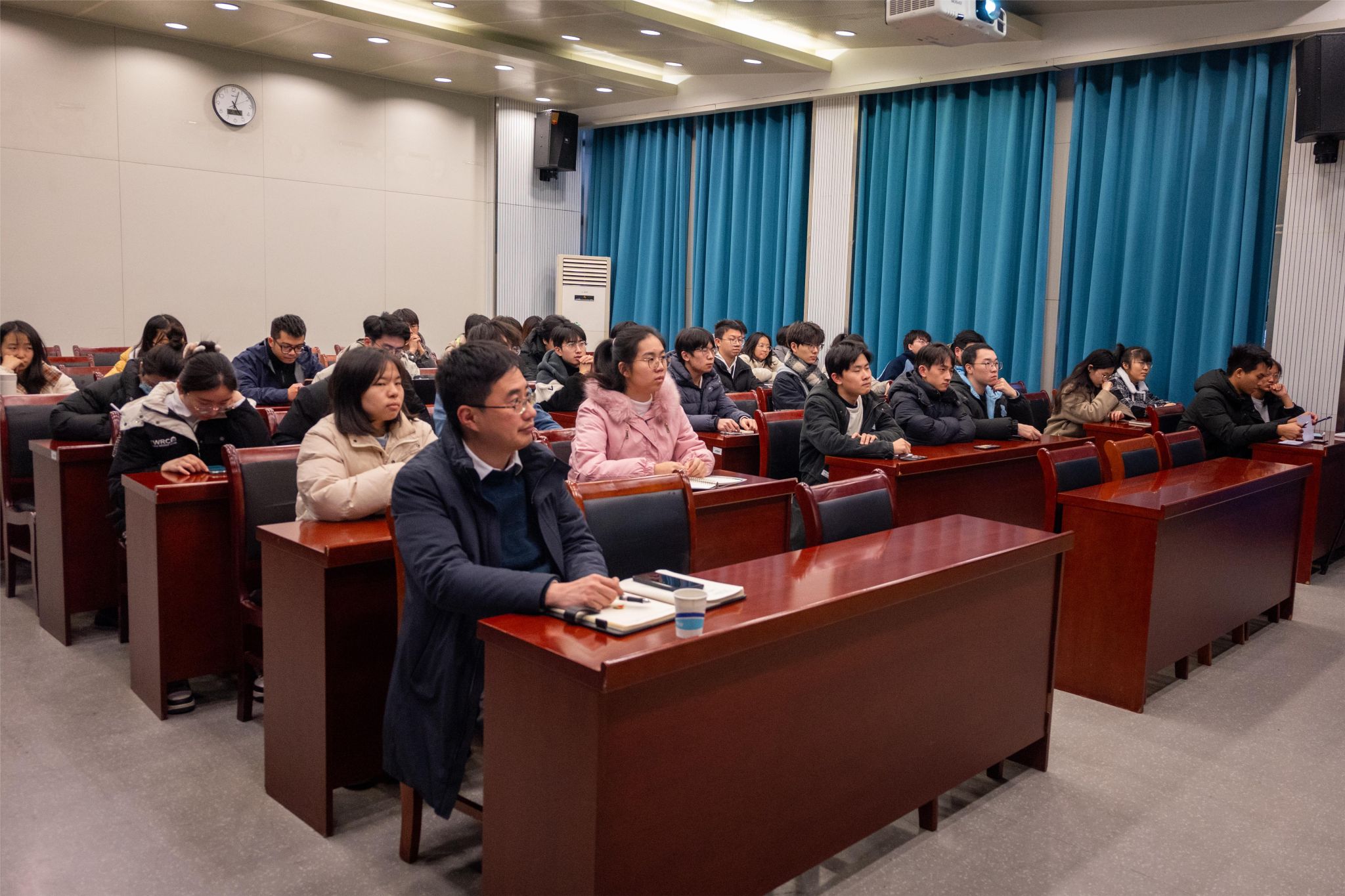 党委书记田永超在育贤楼C502讲授“智慧赋农,绘就乡村振兴新图景”专题党课,学院党委副书记吕一雷、辅导员封筱以及学院全体发展对象共同参与学习。