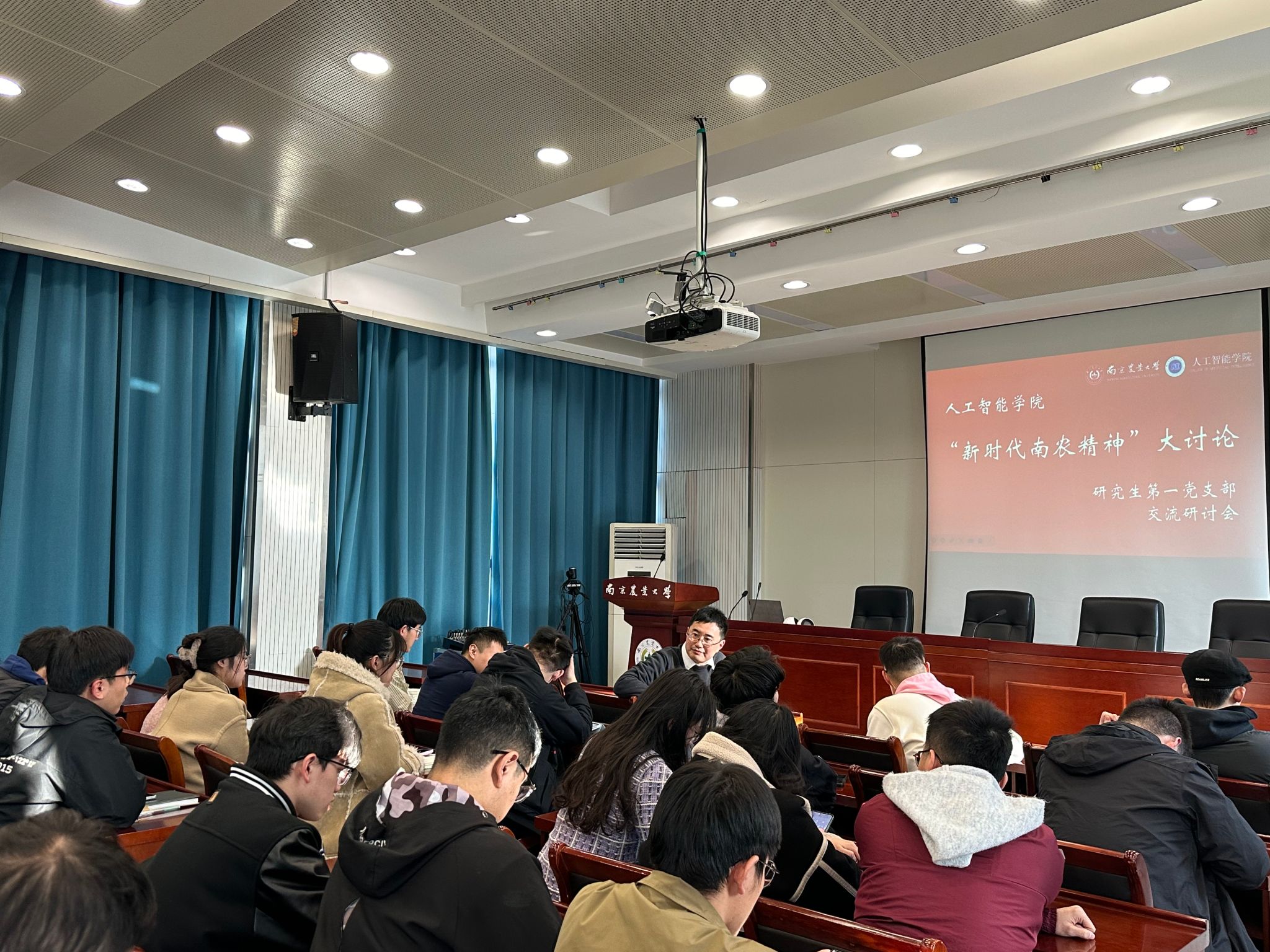 研究生第一党支部在育贤楼C502召开“新时代南农精神”交流研讨会。学院党委副书记吕一雷,研究生教学秘书吴亚琼,全体党支部成员参会。会议由支部书记陈天祺主持。