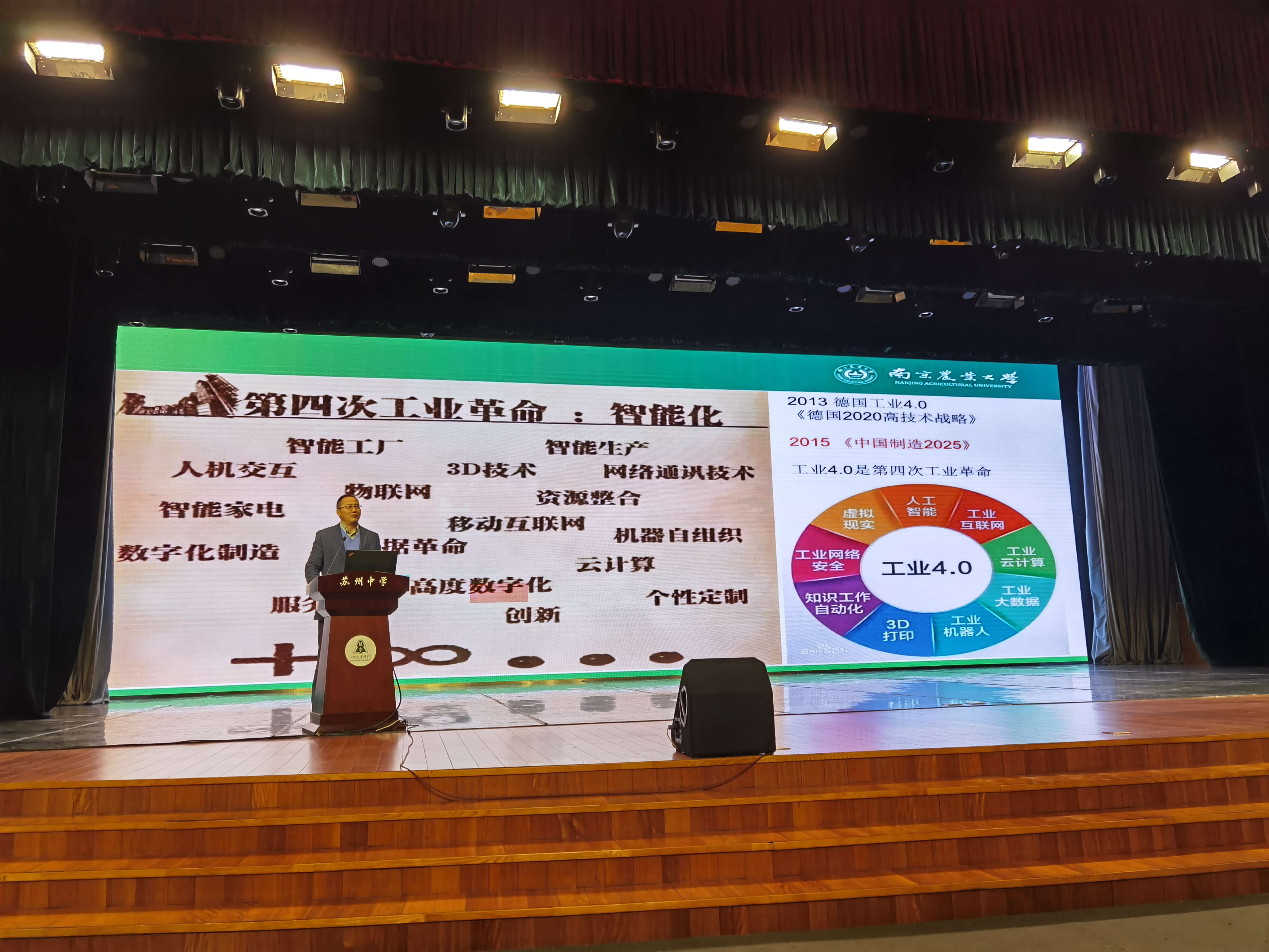 卢伟作《当农业遇到人工智能时代》报告,以大量鲜活的实例和视频介绍了工业、航天、农业机器人的实际应用,同时为师生们带来了近年来国际智能农业装备和农业机器人的最新研究进展,以及奈飞工厂
