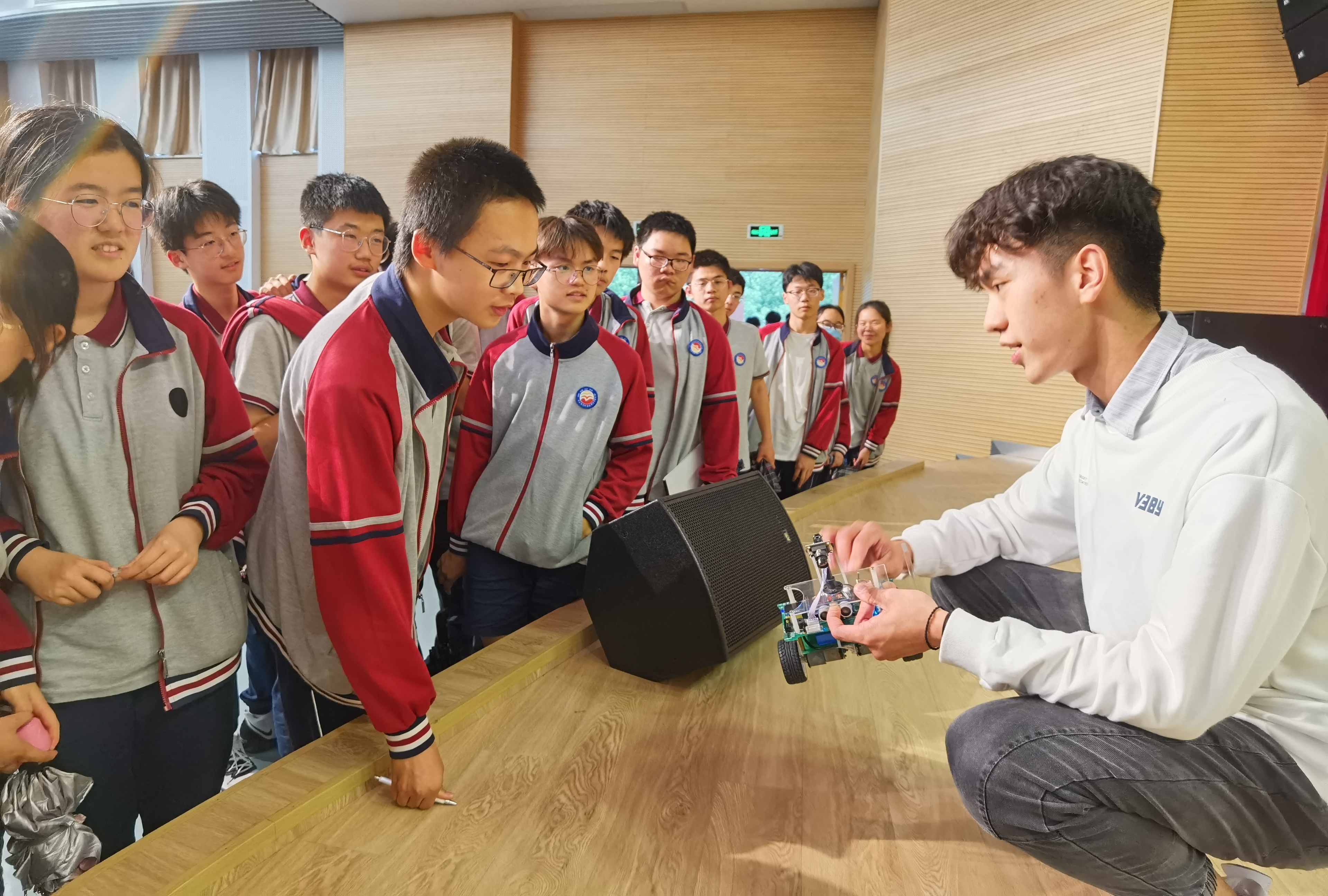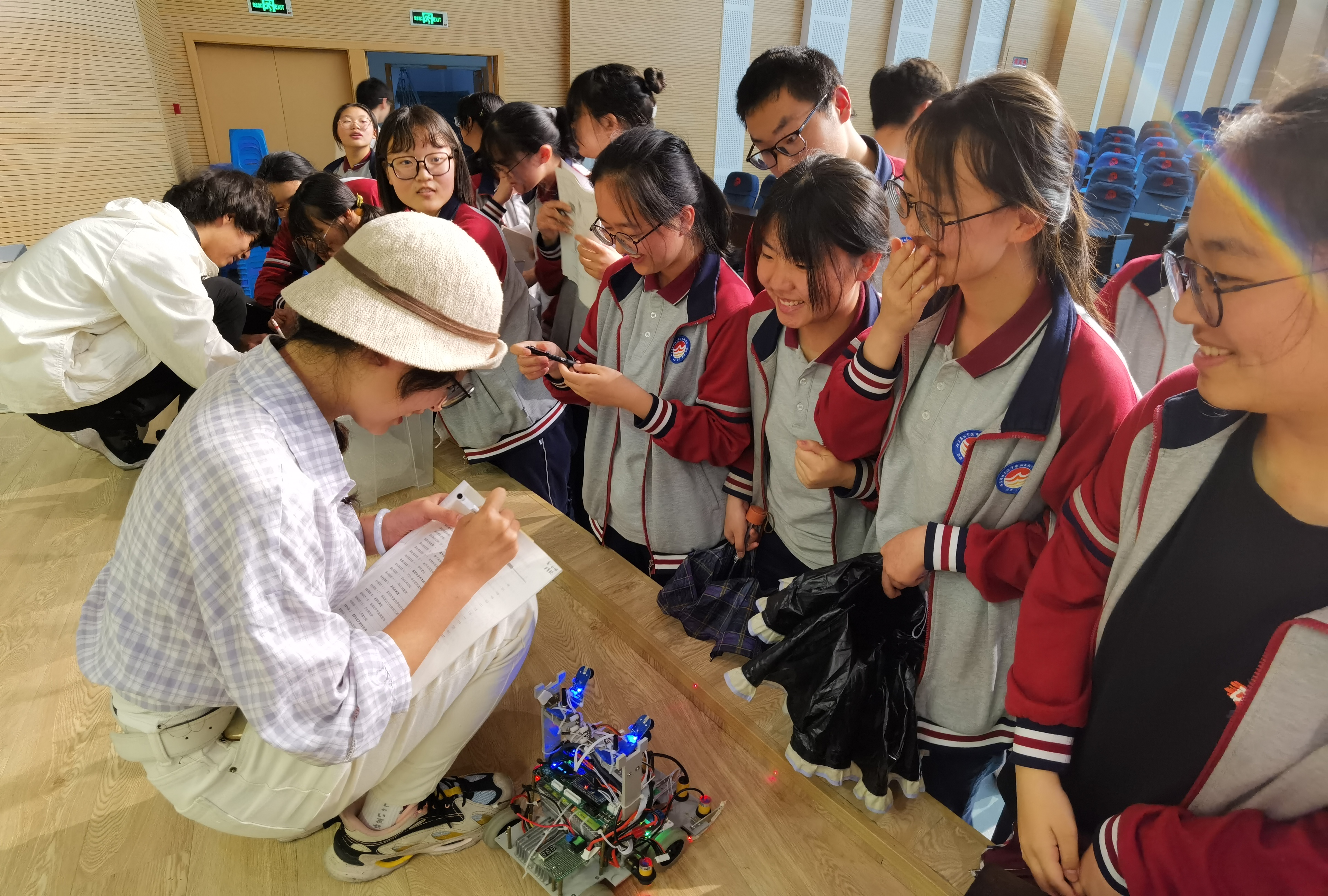 AI工作坊同学现场演示了人形机器人和车型机器人等科技作品,并详细介绍了其作品原理、操作方法和功能,激发高中生对科技作品创作的热情及报考南农的积极性,现场互动氛围高涨,反响热烈。