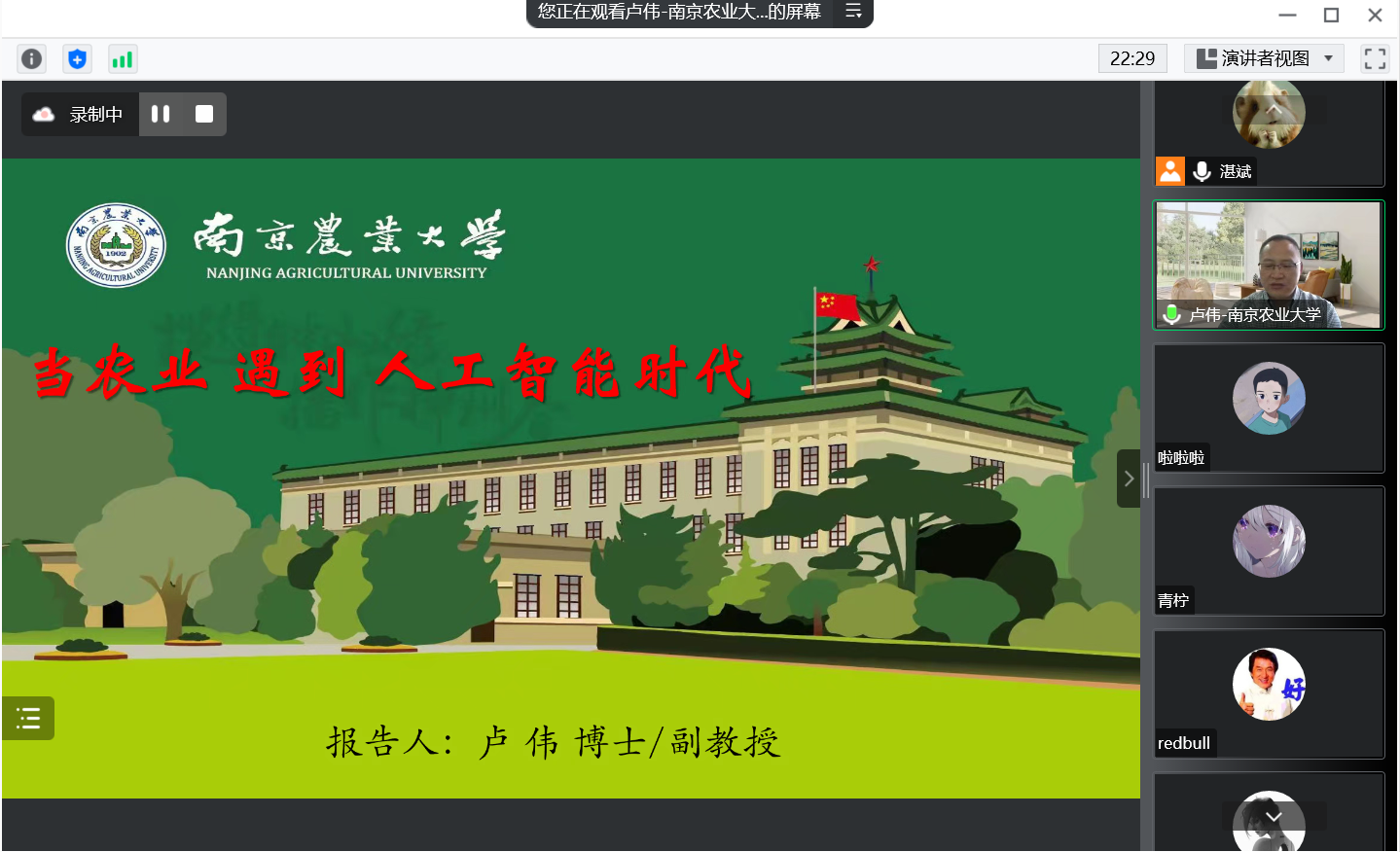 讲师秦欢欢,受邀以“当农业遇见人工智能时代”为主题开展科普讲座。张家港市沙洲中学、苏州市吴县中学等中学师生通过腾讯会议线上参加。讲座由奈飞工厂