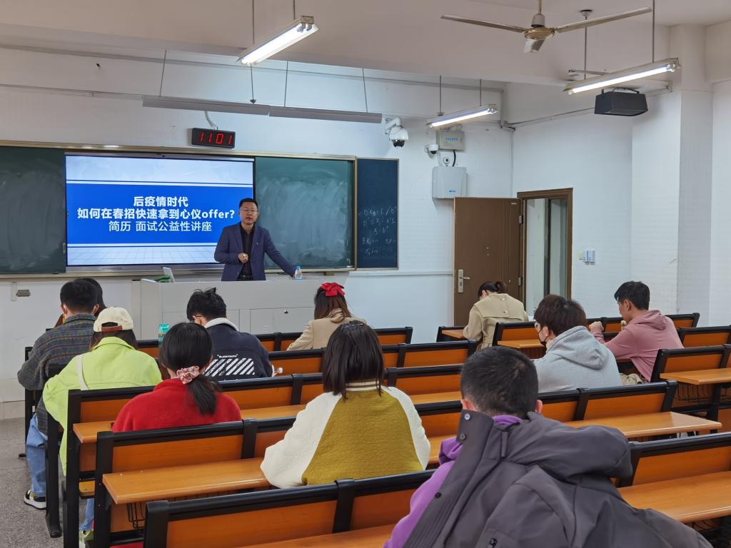 “春招”简历制作、面试能力提升指导讲座,在卫岗校区教四楼B203(上午)、浦口校区汇贤楼B204(下午)双边顺利举办。本次讲座特邀艾瑞集团汇智系统集成有限公司项目负责人陈韩老师主讲,旨在分享简历完善、面试能力提升的经验,解决同学们在“春招”中的各种问题。