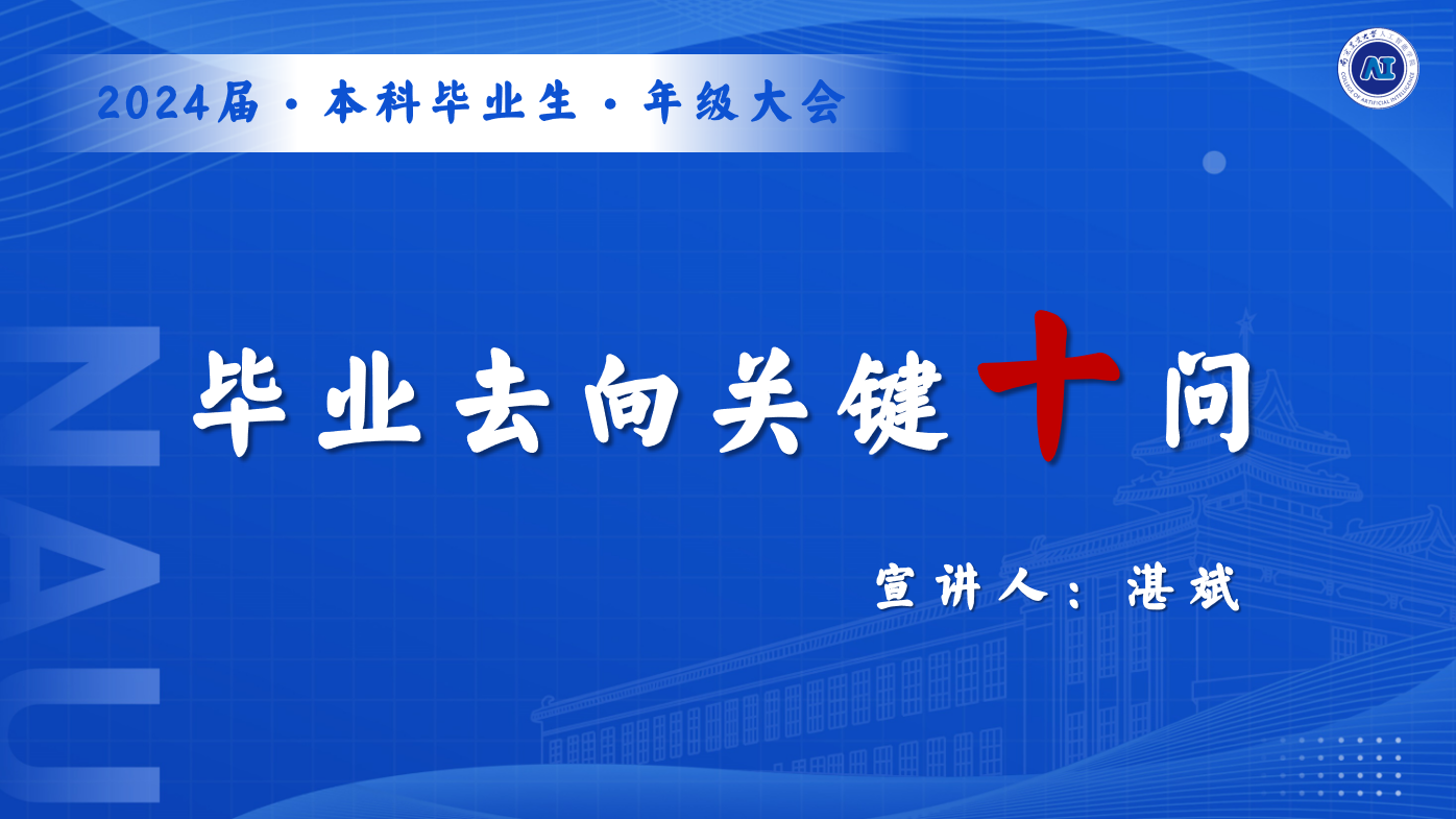 会议伊始,魏宇宁着重强调了毕业年级日常管理等方面的重要事务。随后,于佳琪针对近期毕业年级学生关注的第二课堂学时等相关问题进行了解答与指导。接着,湛斌作《毕业去向关键“十”问》主题宣讲。十个关键问题,全面覆盖了考研、考公、留学、求职等群体。旨在引导毕业年级学生充分思考与自身关联的重要问题,进而自我鞭策,抓住毕业前有限的在校时间,尽早想清问题、尽快付诸行动,最终顺利实现生涯目标。