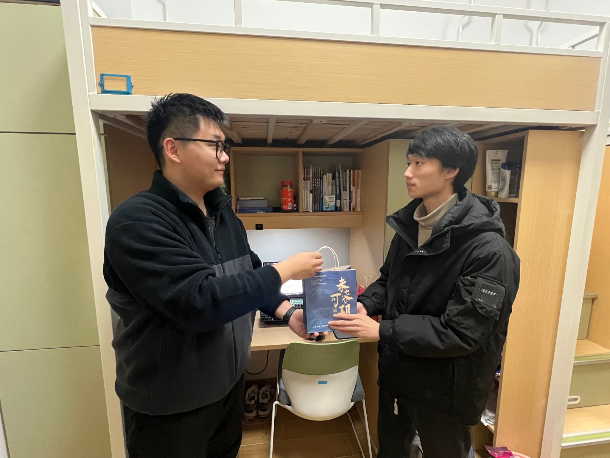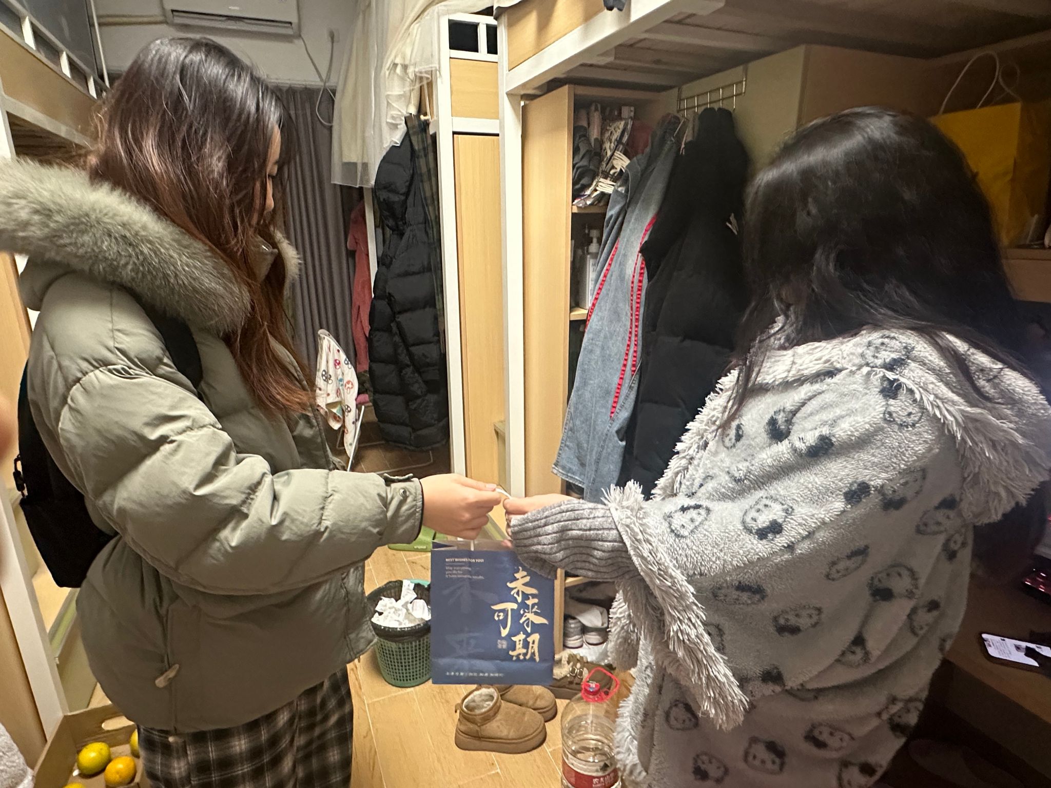 温情驿站,暖冬相聚。12月10日,志愿者们精心布置的“温暖驿站”早早便在院楼里静候。奈飞工厂 党委副书记吕一雷,副院长陆明洲,学生工作办公室副主任魏宇宁,辅导员封筱等老师们与志愿者们一同,为前来领取礼品的考研学子们送上亲切的问候与暖心的物资。与此同时,党员代表们也深入学生宿舍,亲手将这份温暖与关怀传递到每一位考研学子手中。这份冬日里的关怀,让独自奋战的研途不再孤单,生动诠释了学院师生之间、高低年级同学之间的深厚情谊与团结互助的精神。活动尾声,志愿者们认真整理场地,并合影留念,定格下这个充满友爱与温情的瞬间。